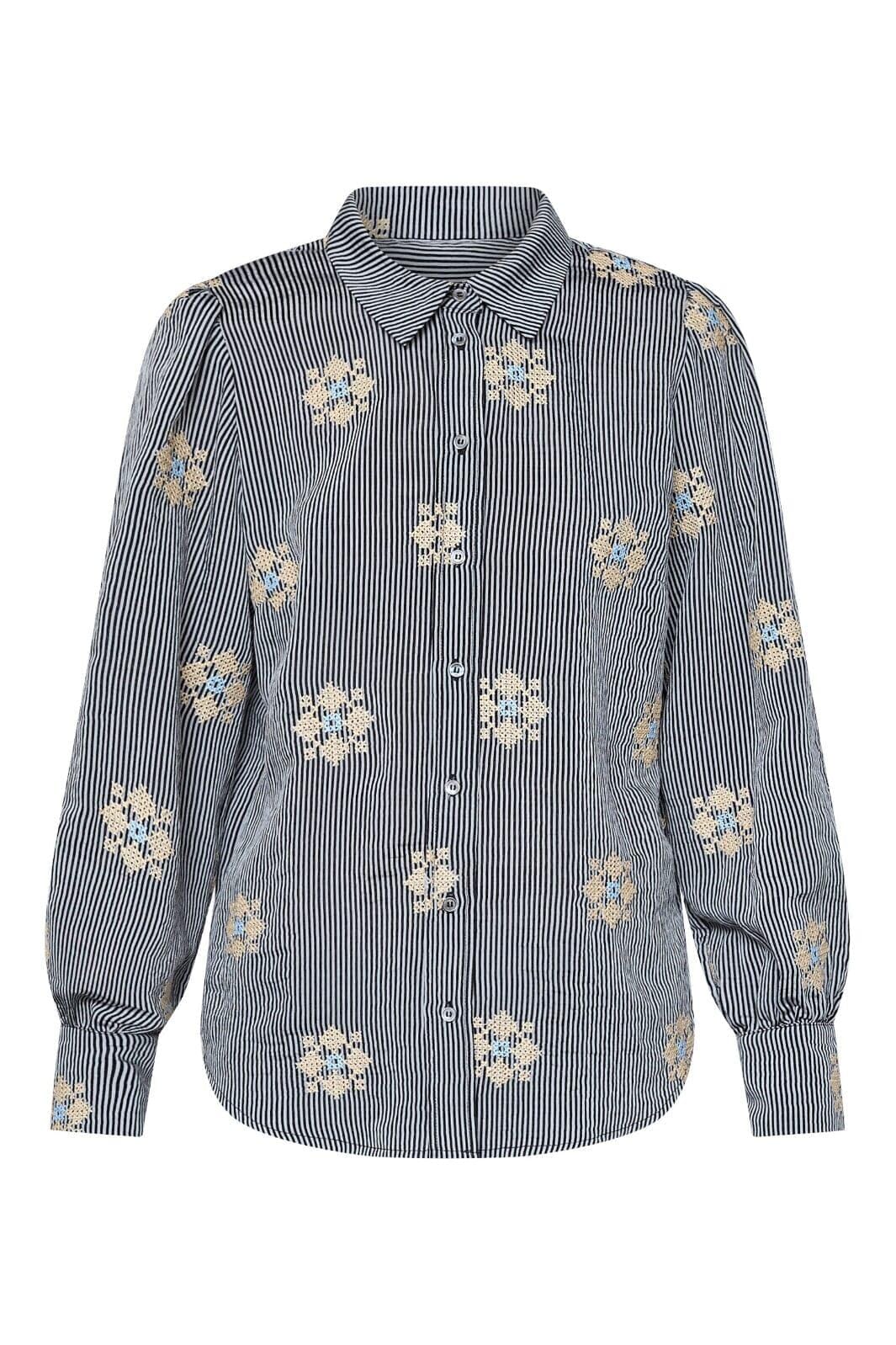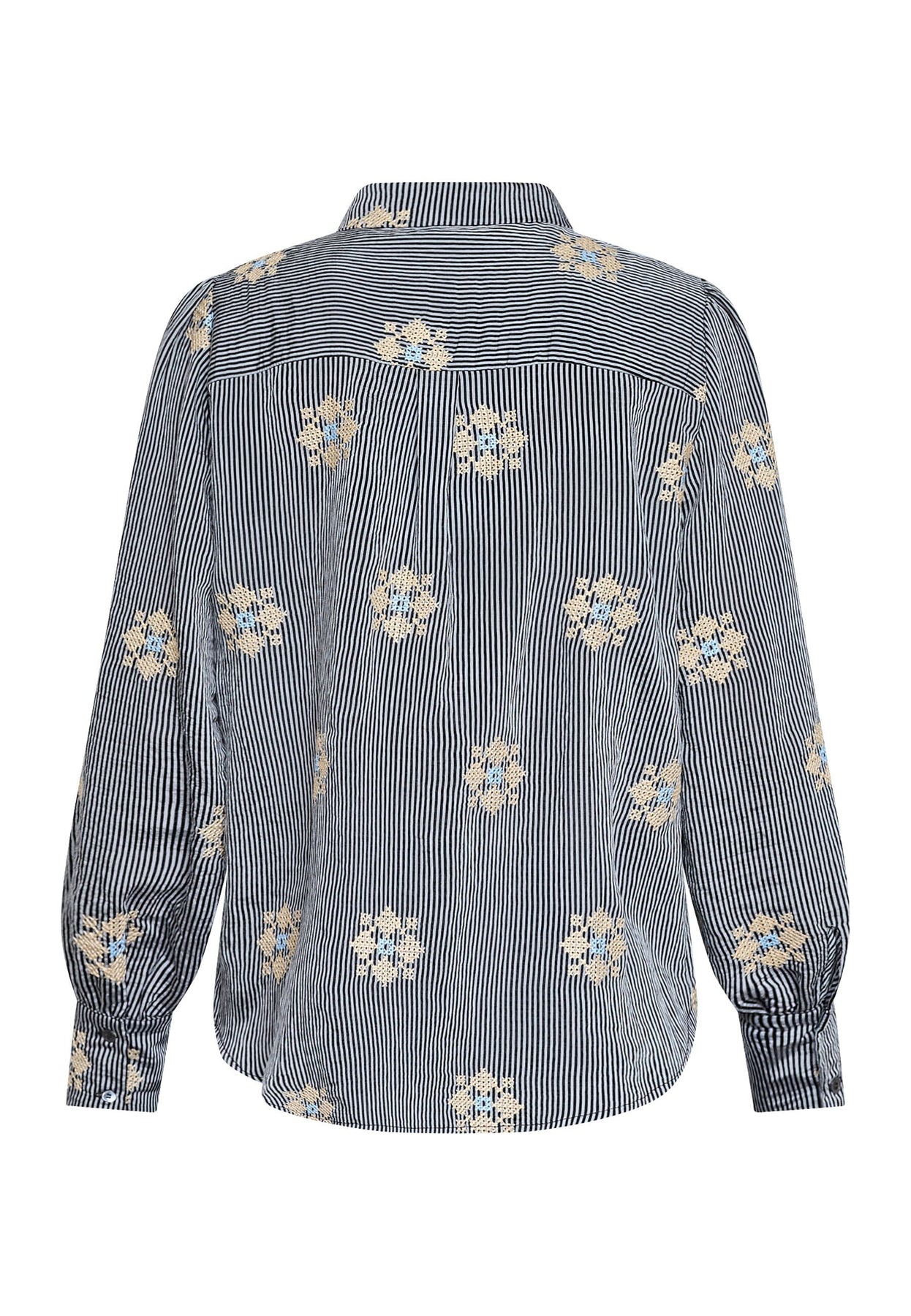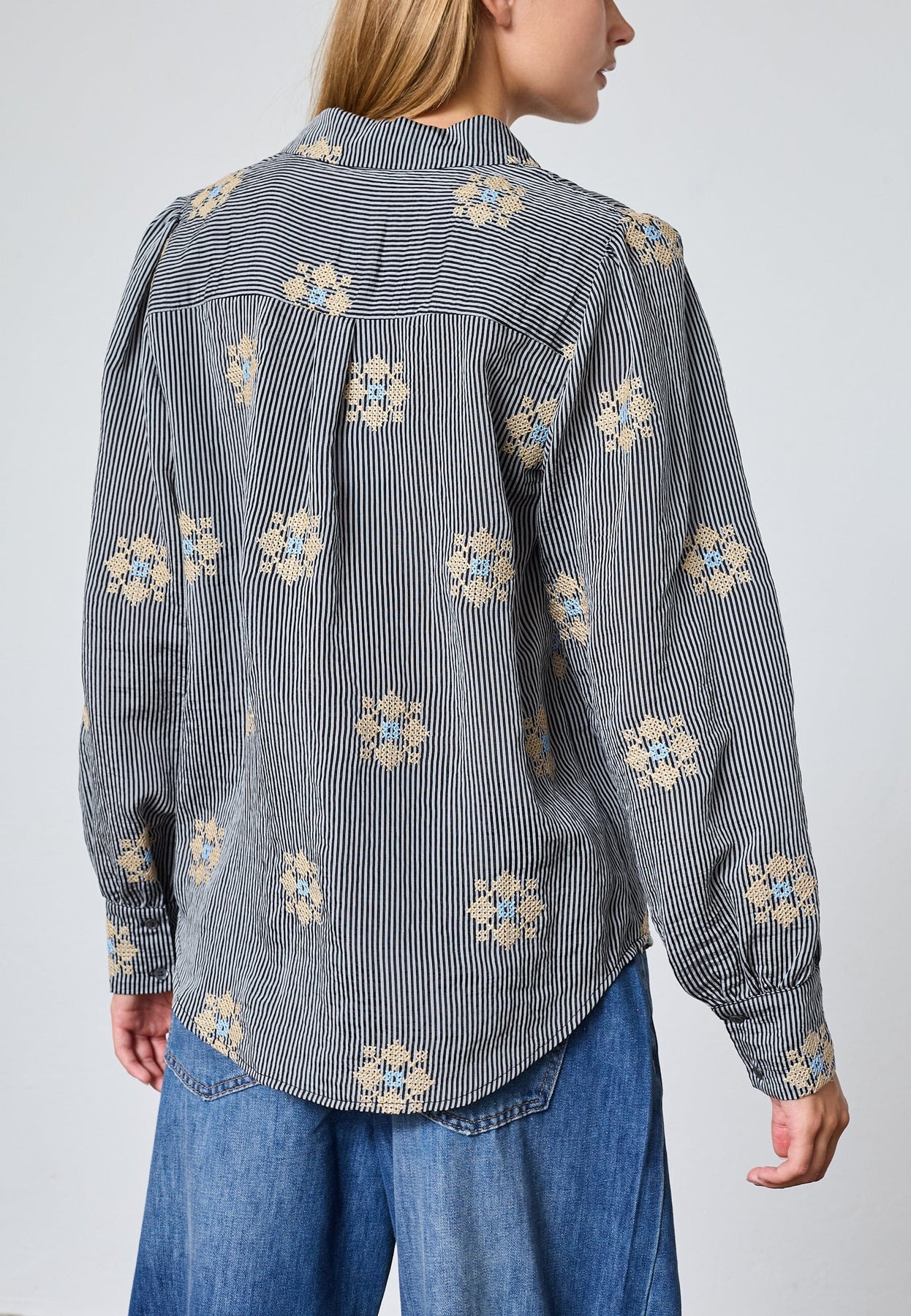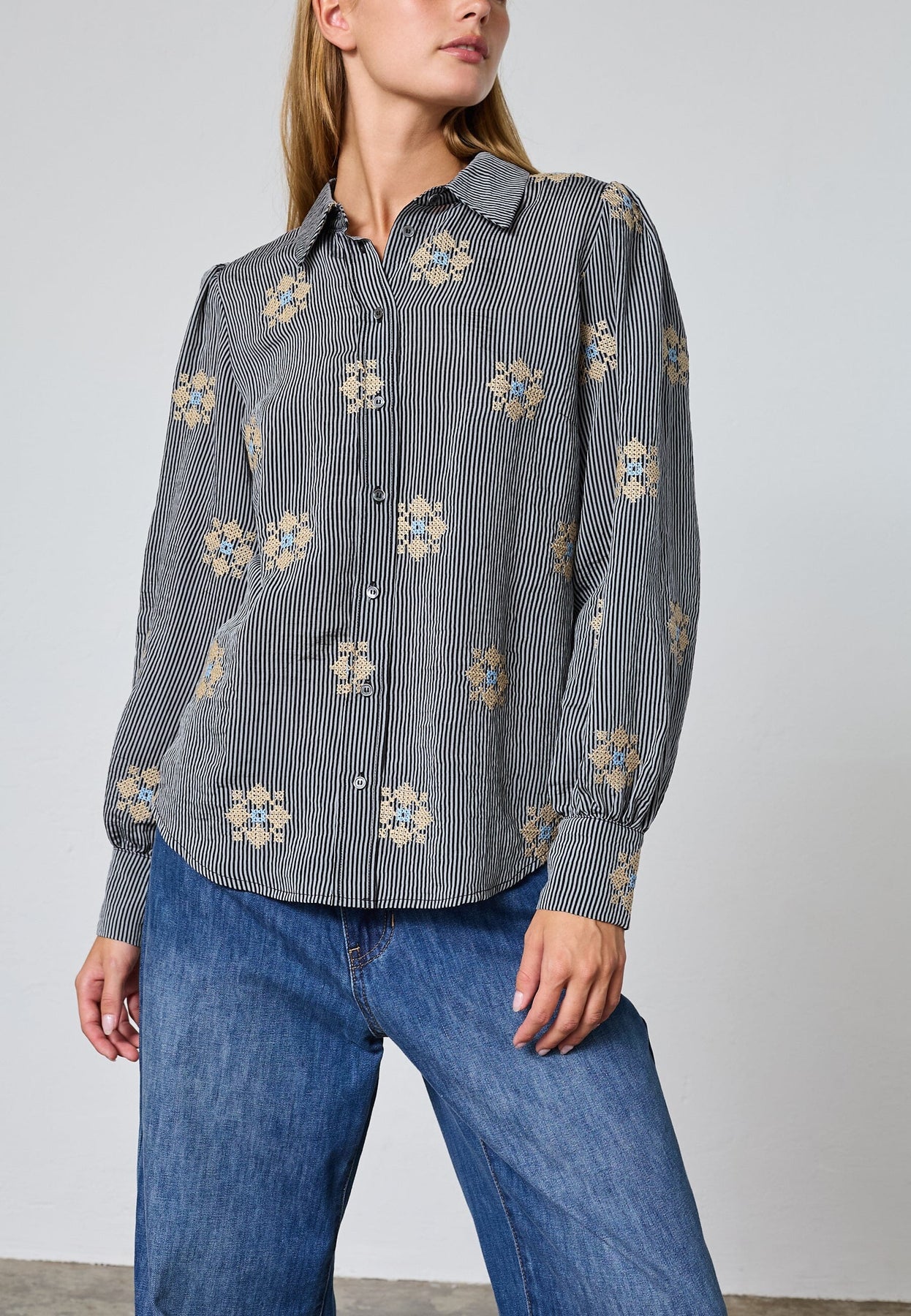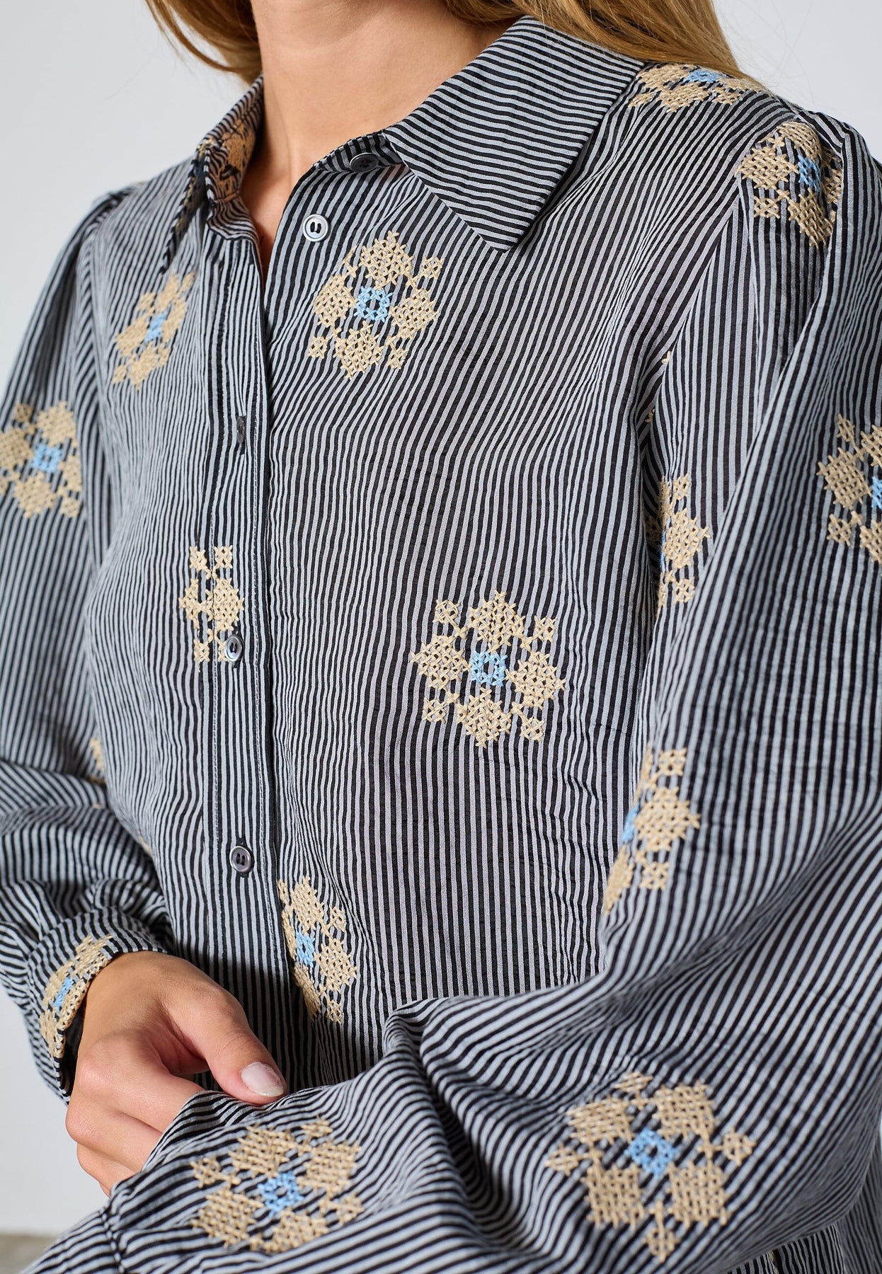 Koszula w paski od Love & Divine z czarnymi i białymi paskami. Koszula ma haftowane detale kwiatowe, które tworzą kontrast z pasiastym wzorem.