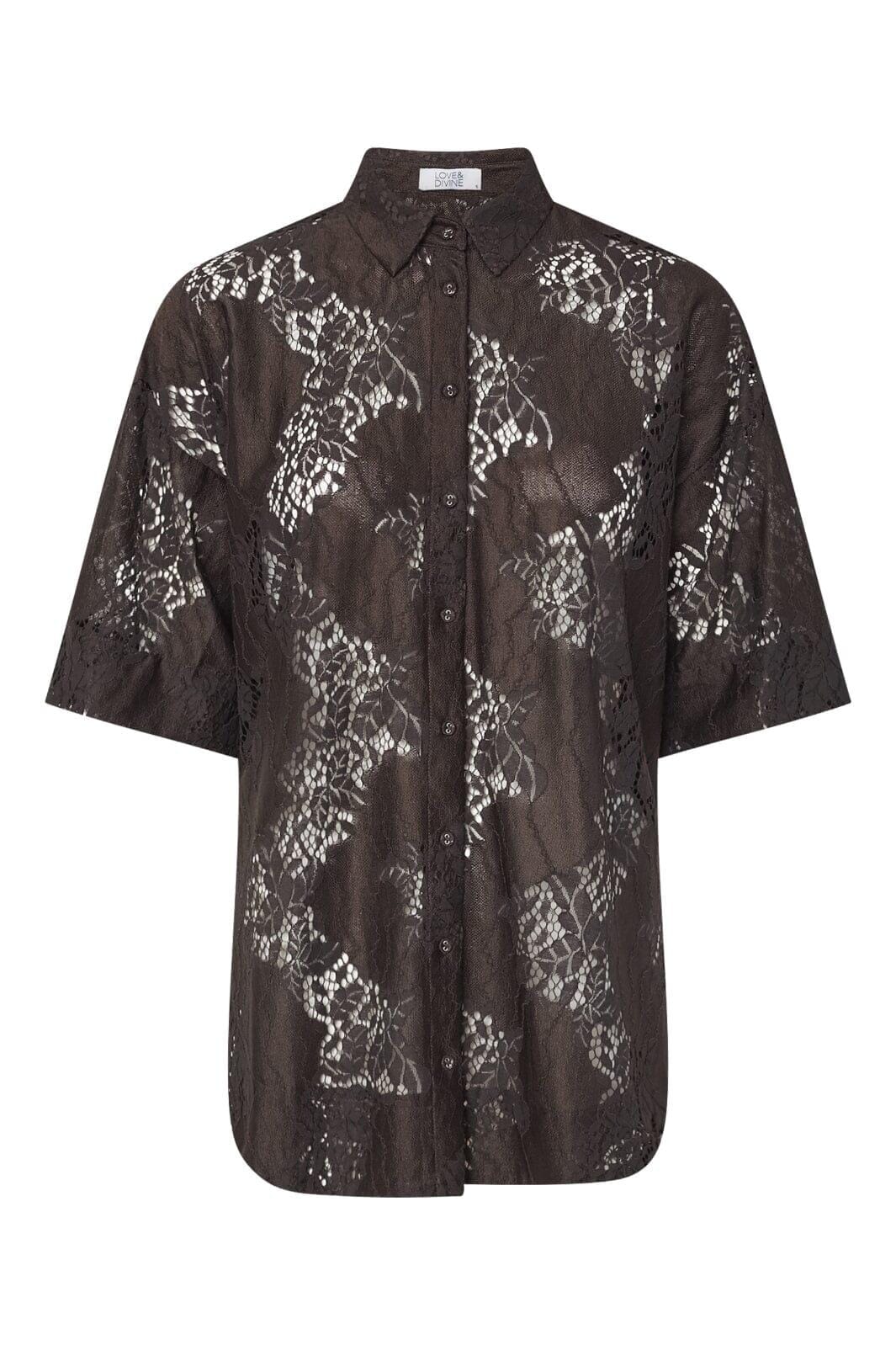 Ciemnobrązowa koszula od Love & Divine z koronką. Koszula ma luźny krój, krótkie rękawy i klasyczny kołnierzyk z zapięciem na guziki z przodu.