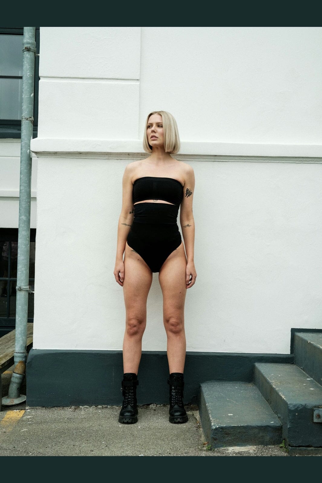 Czarny biustonosz bandeau od Lykkeland Ateliér z gładką powierzchnią i szwem środkowym. Prosty biustonosz o okrągłym kształcie i dobrej podpórce.