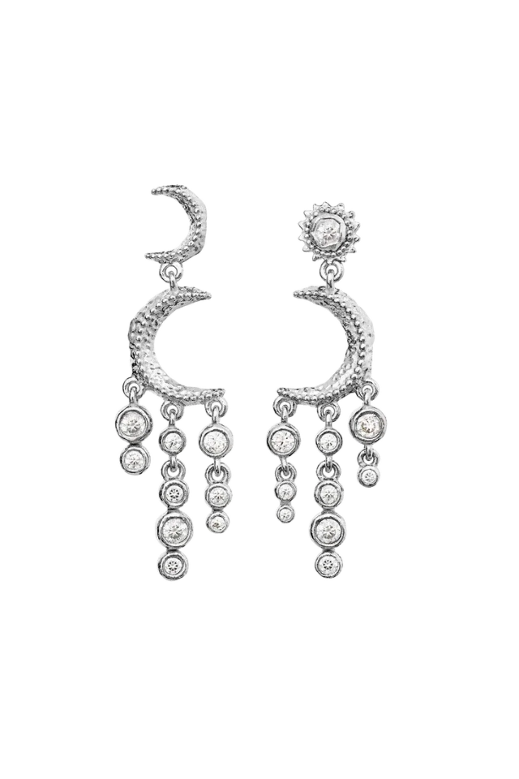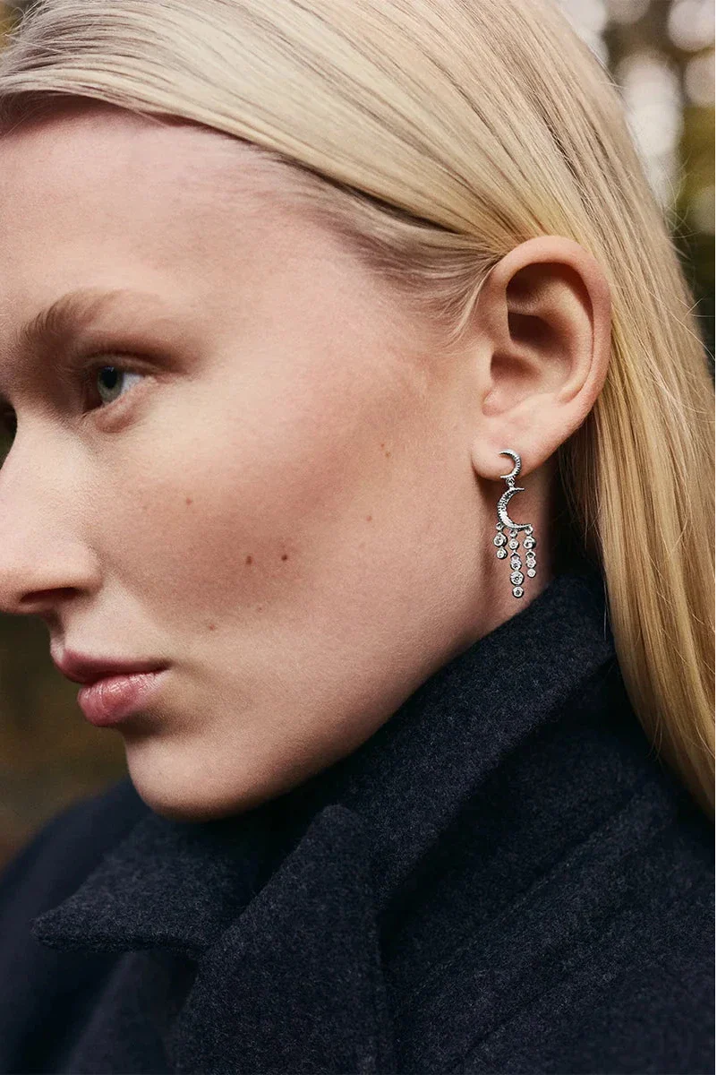 Kolczyki Maanesten z półksiężycowatym wzorem. Każdy kolczyk ma kilka wiszących elementów wysadzanych kamieniami w srebrnym kolorze.
