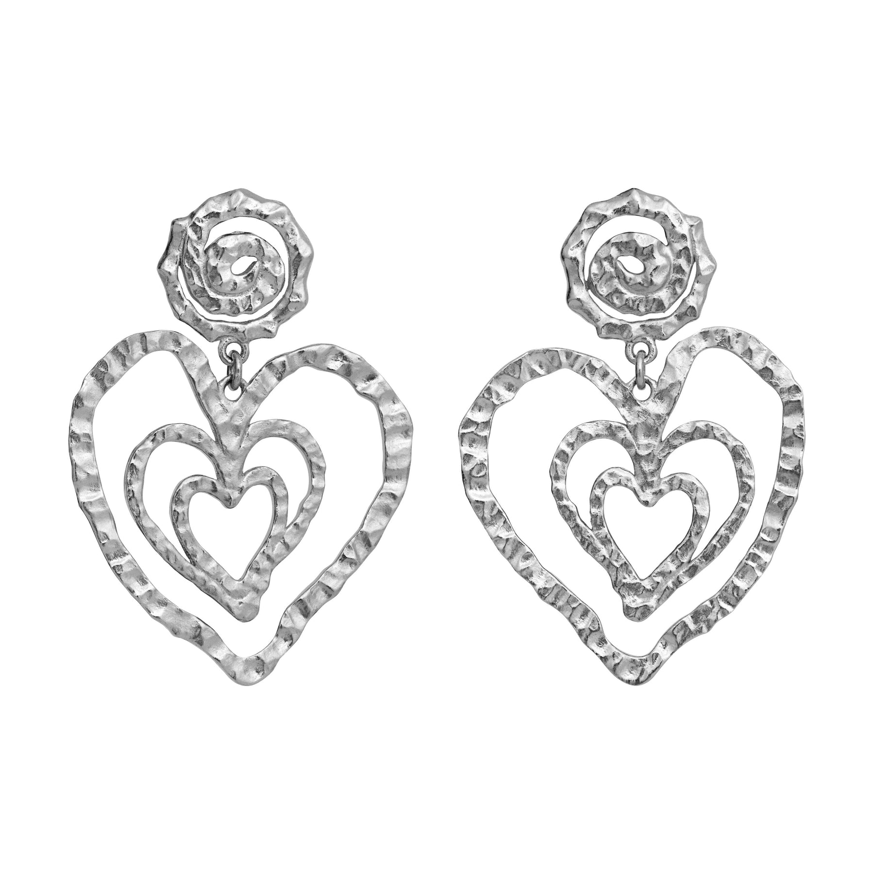 Kolczyki marki Maanesten, wykonane z recyklingowanego srebra sterlingowego z nachodzącymi na siebie kształtami serc i młotkowaną powierzchnią.