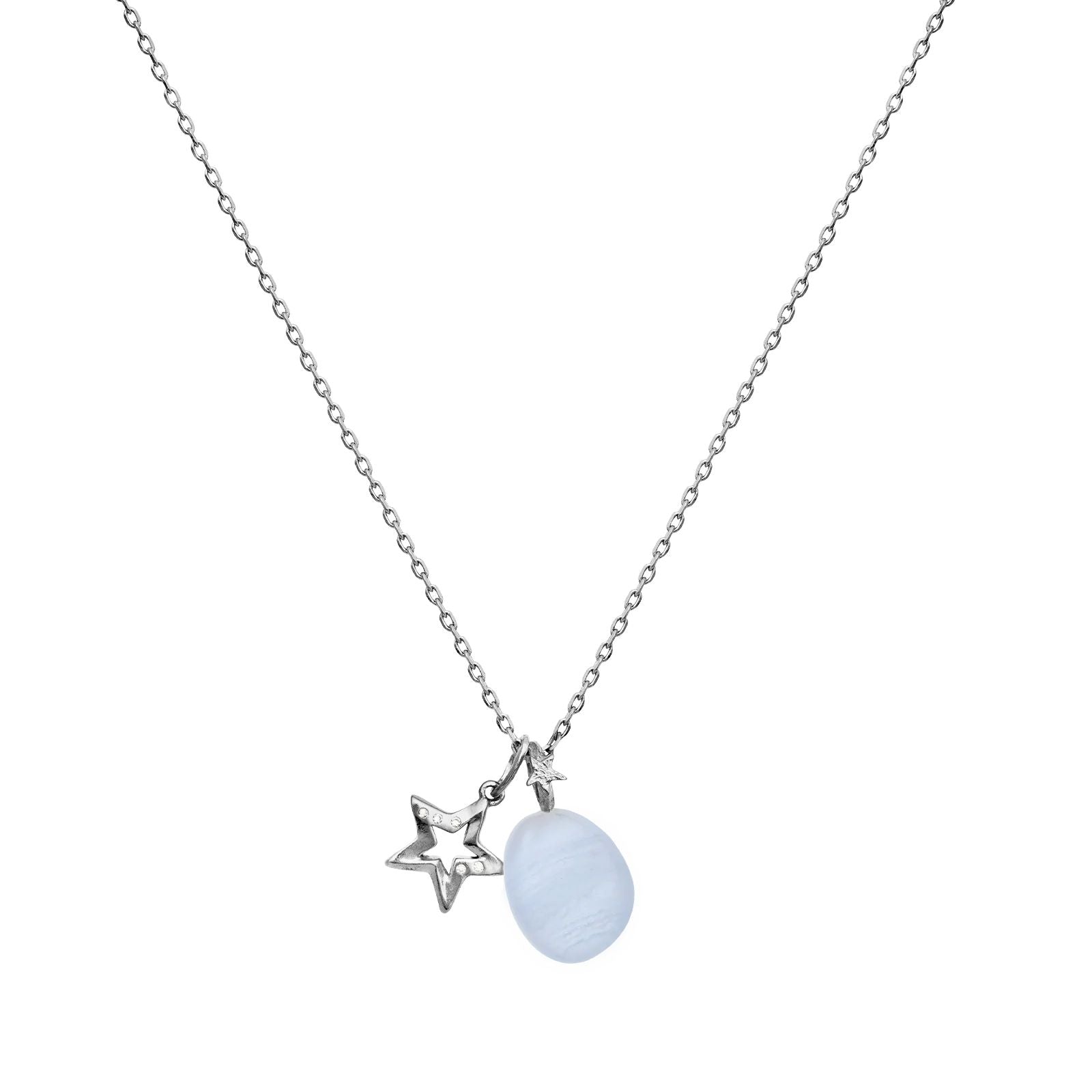 Zawieszka od Maanesten z jasnoniebieskim kamieniem i detalem w kształcie gwiazdy ze srebra. Zawieszka wykonana jest z recyklingowanego srebra próby 925.