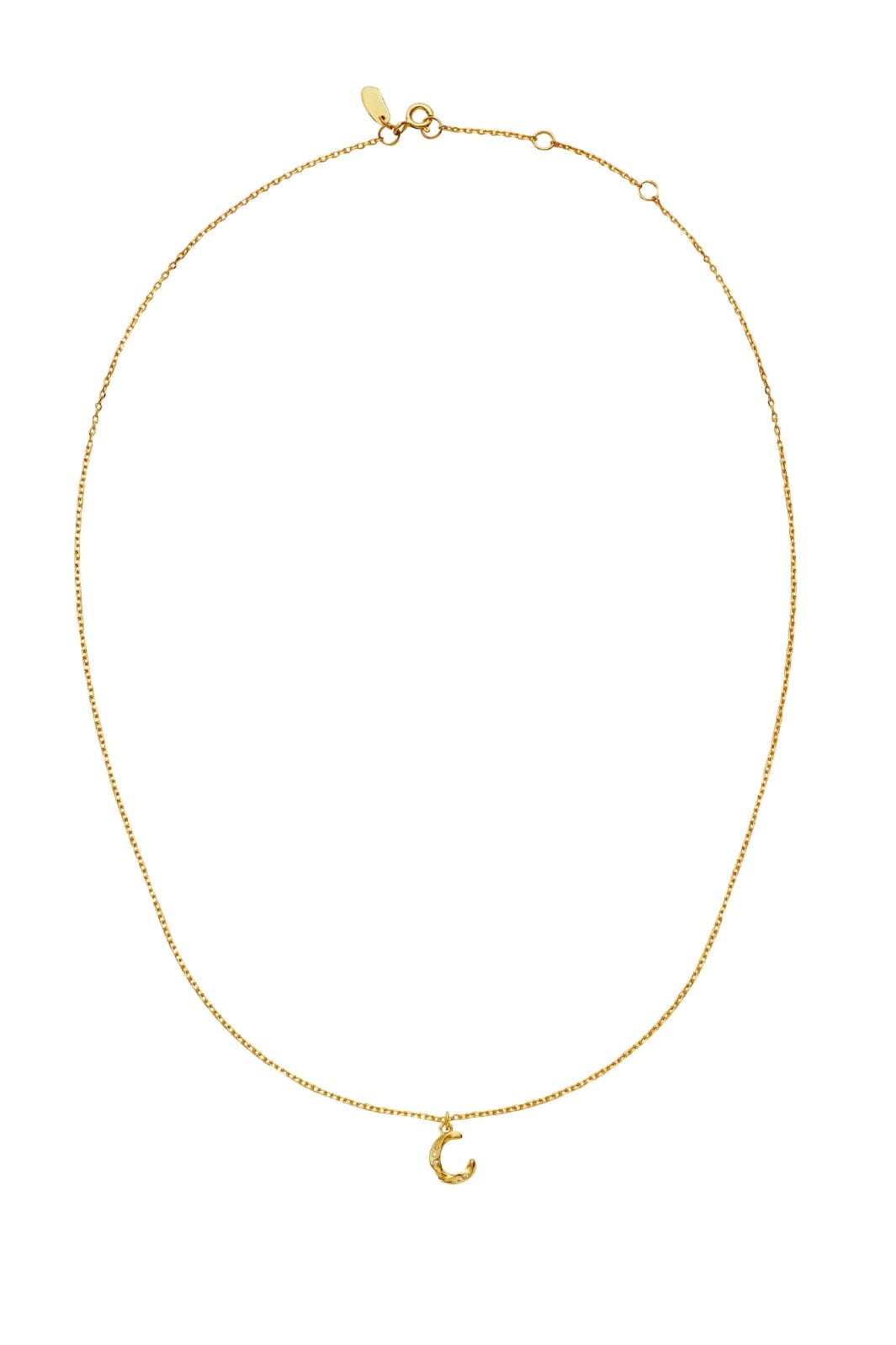 Złocony naszyjnik od Maanesten z zawieszką w kształcie C. Zawieszka ma wstawione małe kamienie i znajduje się na złotej łańcuszku o regulowanej długości.