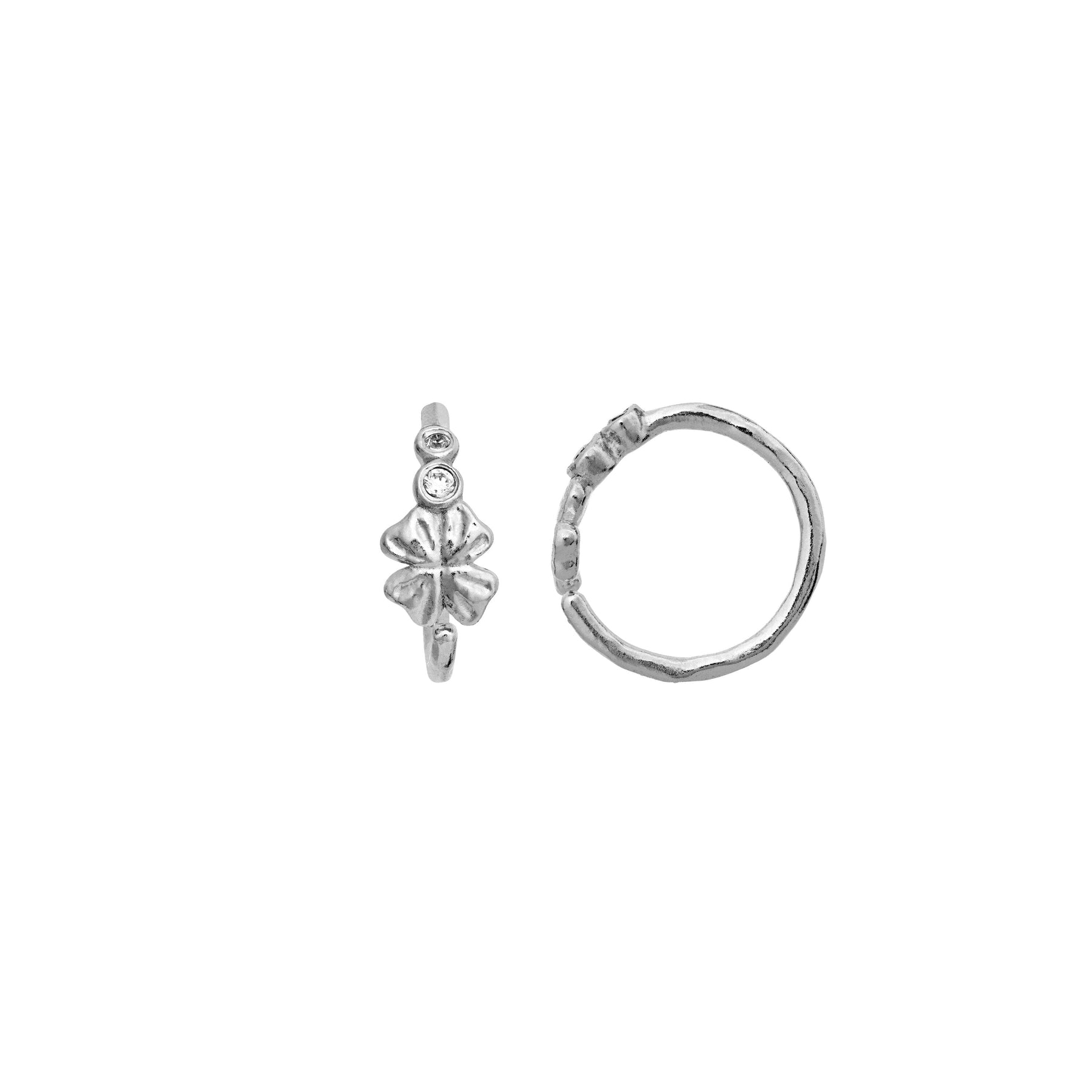 Kolczyki marki Maanesten, wykonane z recyklingowanego srebra sterlingowego. Każdy kolczyk ma okrągły kształt z kwiatową ozdobą i małymi oprawionymi kamieniami.