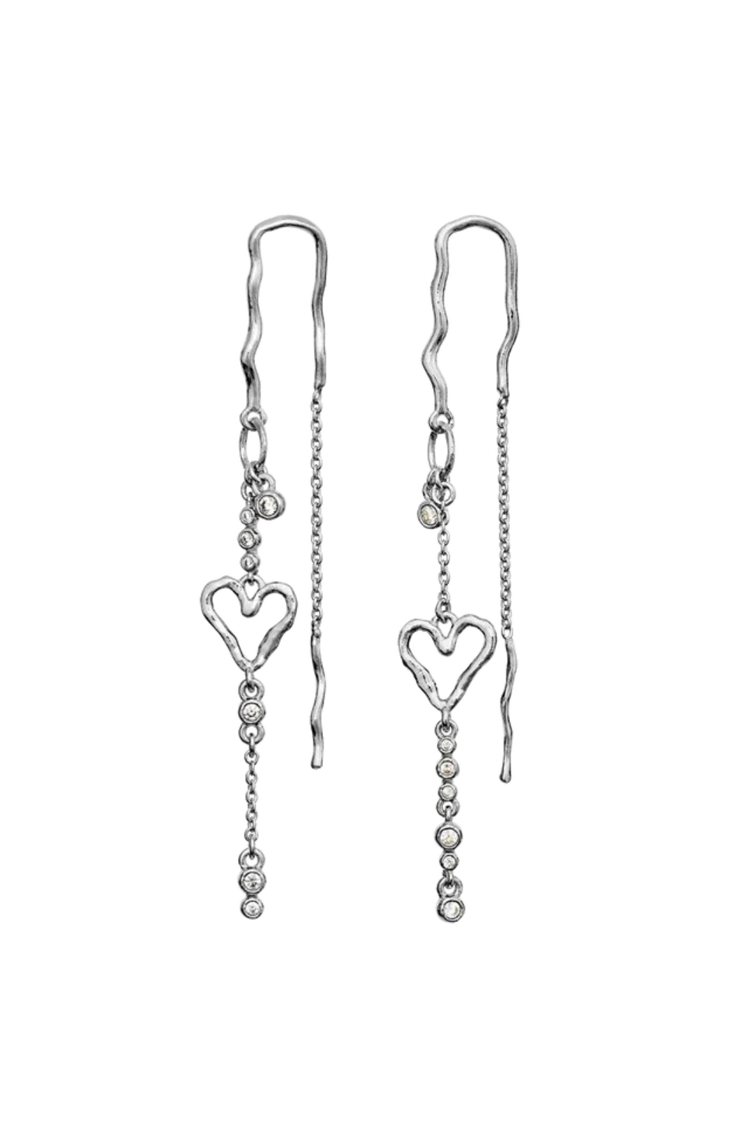 Długie kolczyki Maanesten z serduszkowym motywem i małymi okrągłymi detalami na łańcuszkach. Wykonane z recyklingowanego srebra próby 925 i pozłacane 18-karatowym złotem.