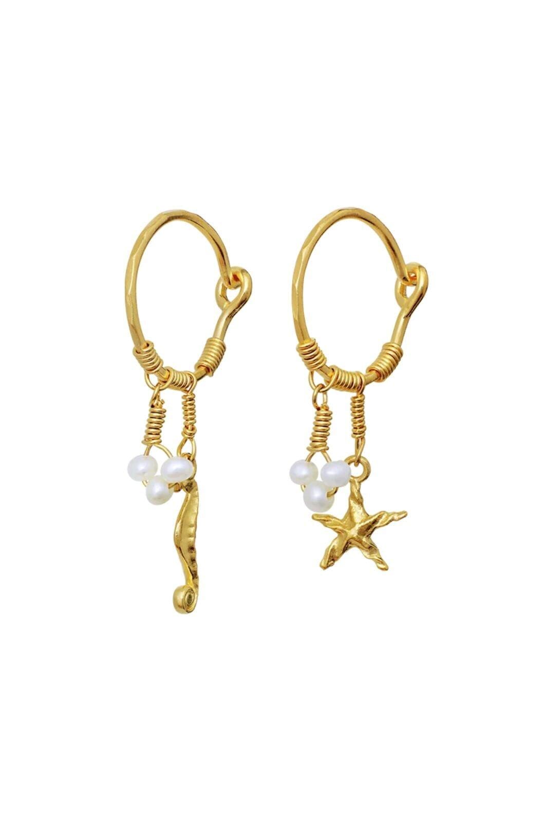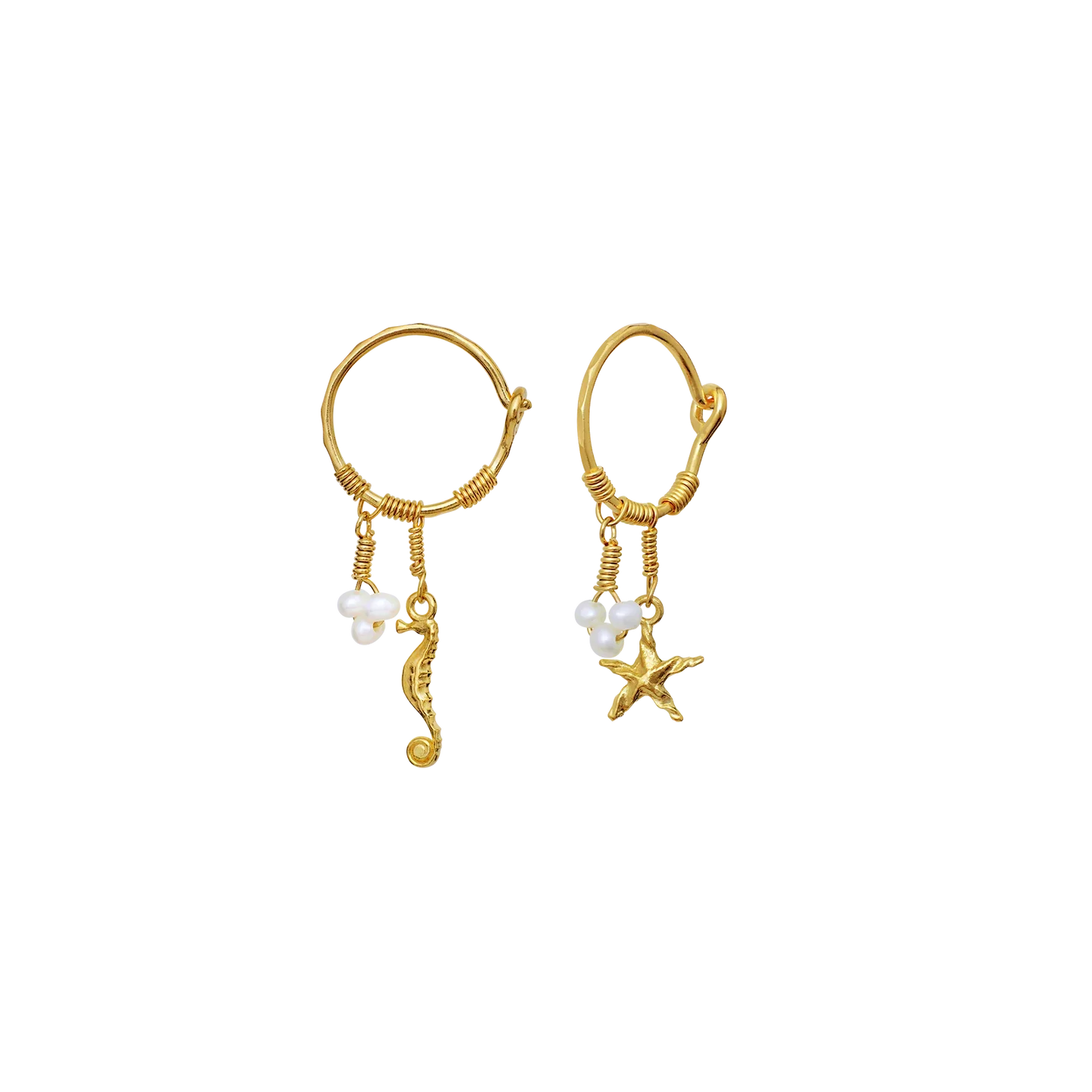 Ozdobione złotem kolczyki od Maanesten z zawieszkami w kształcie rozgwiazd i koników morskich. Małe kółka mają perły słodkowodne i zawieszki z drutu, które tworzą morski wyraz.
