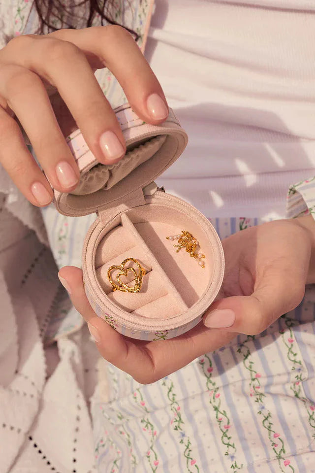 Okrągłe pudełko na biżuterię marki Maanesten z kremowego materiału z ogrodowym, dekoracyjnym wzorem kwiatów i owoców w jasnoniebieskich i białych odcieniach.