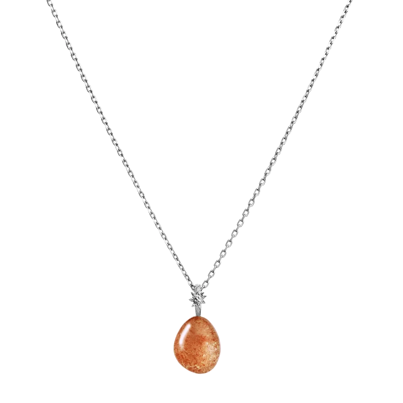 Zawieszka od Maanesten z pomarańczowym kamieniem w kształcie kropli. Zawieszka ma u góry mały motyw gwiazdy, który łączy kamień z łańcuszkiem.