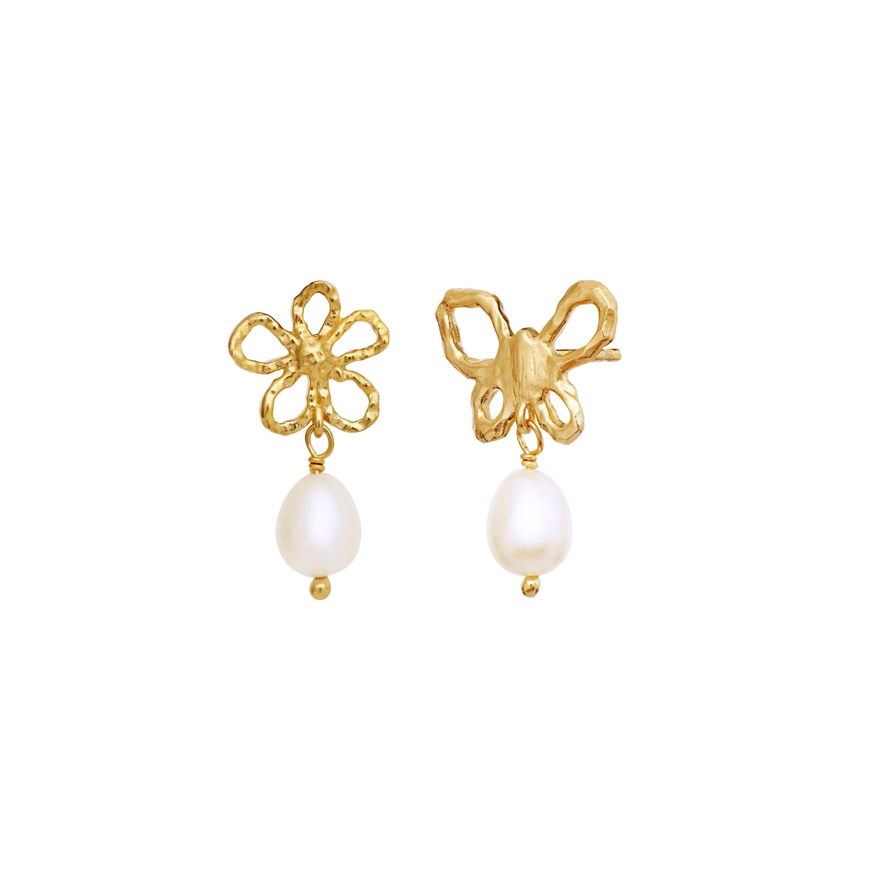 Kolczyki Maanesten z górną częścią w kształcie kwiatu i motyla w kolorze złotym oraz białą perłą zwisającą z każdego kolczyka.
