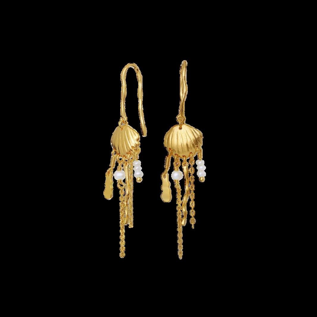 Złote kolczyki od Maanesten o asymetrycznym designie. Perły słodkowodne i muszle wiszą na łańcuszkach, tworząc naturalny i morski wyraz.