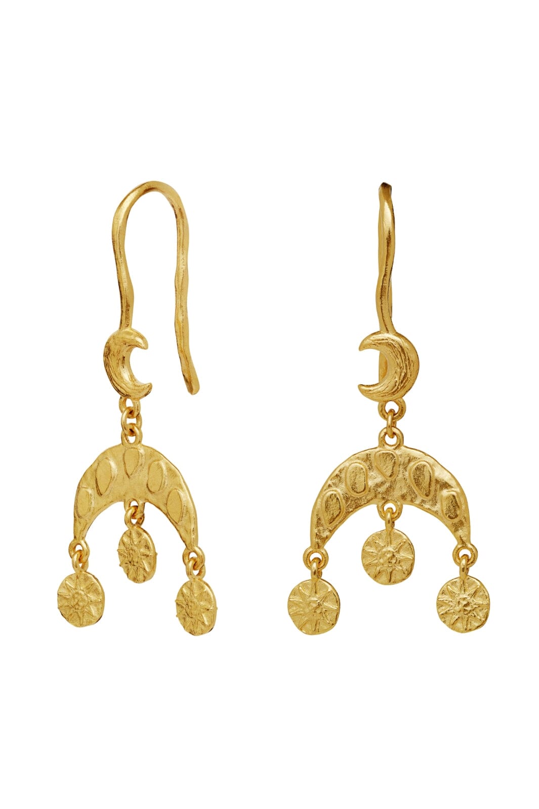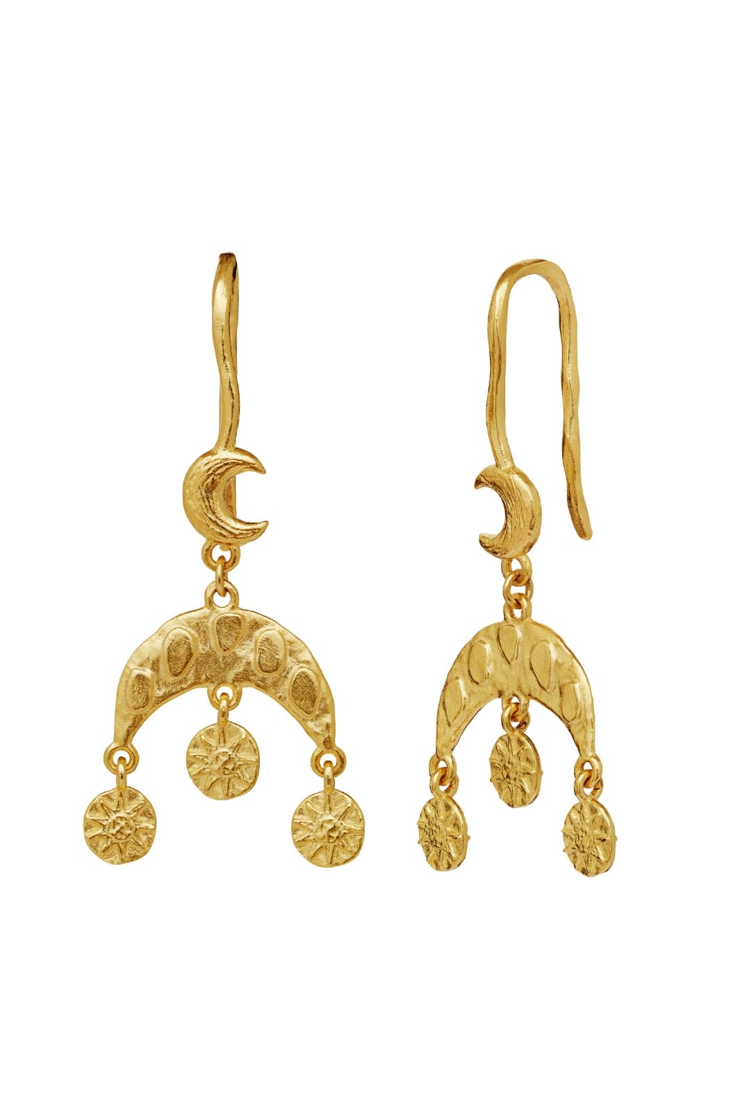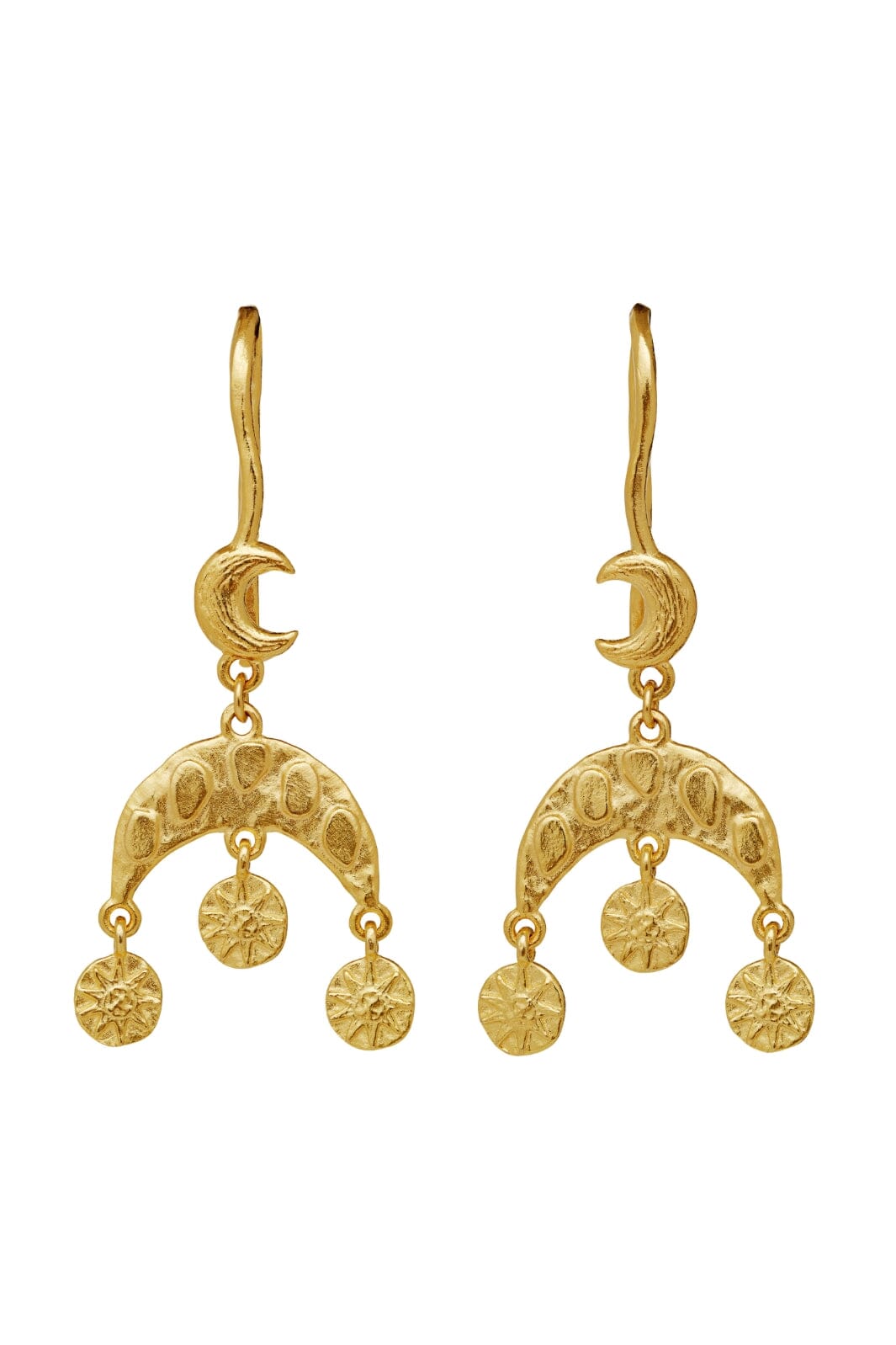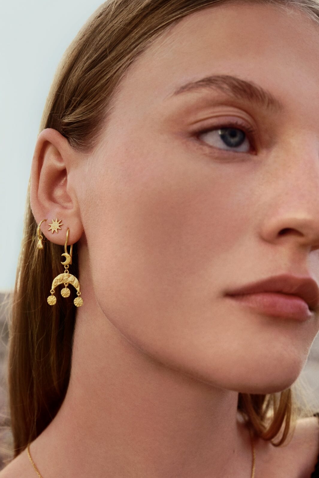 Złote kolczyki od Maanesten z górną częścią w kształcie półksiężyca i wiszącymi okrągłymi dyskami. Kolczyki mają design z niebiańskimi motywami i ruchomymi elementami.