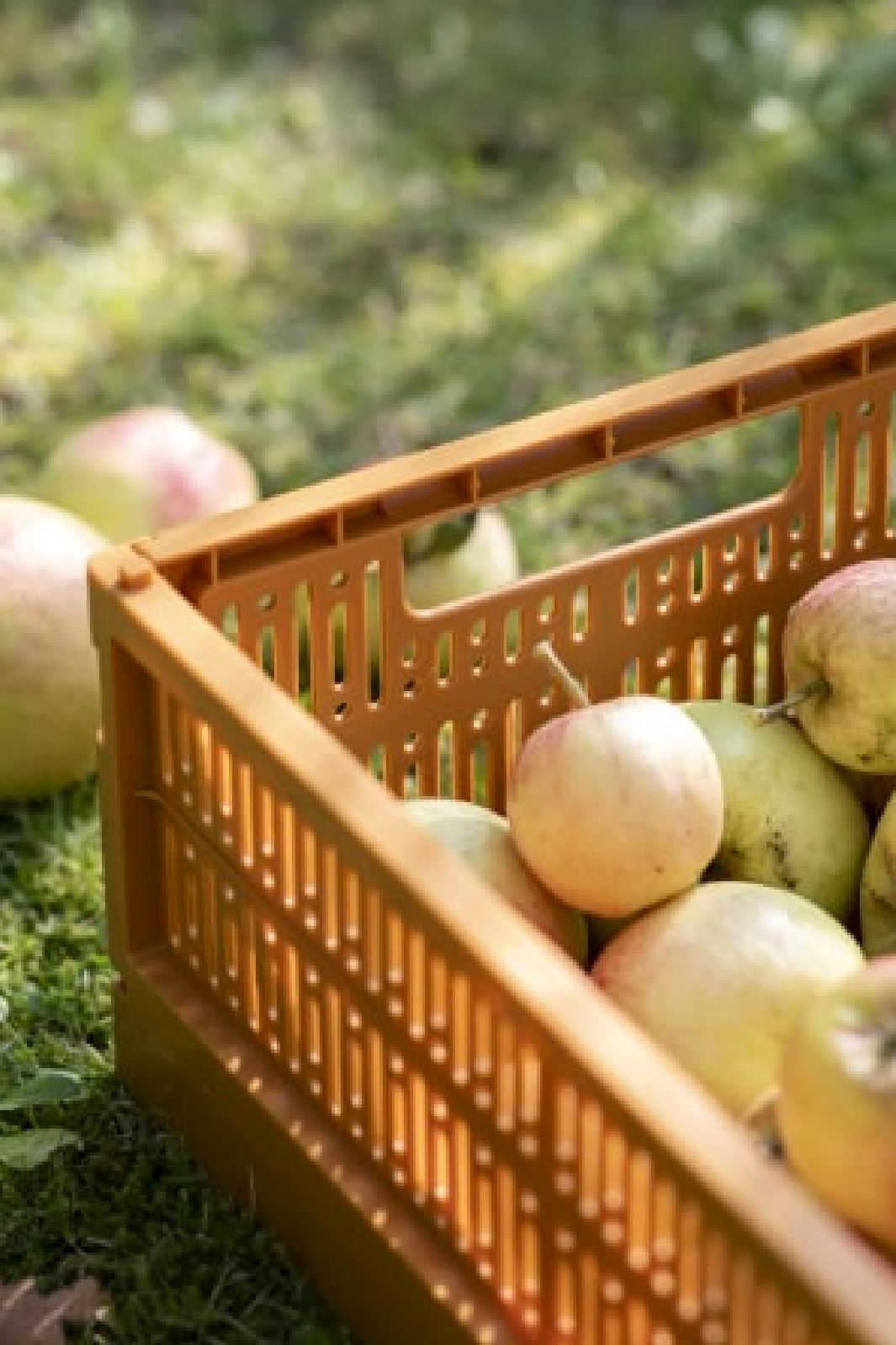 Pojemnik do przechowywania Made Crate w kolorze musztardowym. Wykonany w 100 % z recyklingowanego plastiku PP. Można go układać w stosy z innymi rozmiarami i jest zatwierdzony do przechowywania żywności w lodówce.