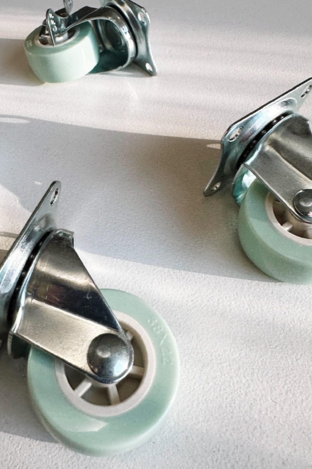 Koła od Made Crate w miętowym odcieniu z metalowymi detalami w kolorze srebrnym. Zostały zaprojektowane jako akcesoria do pojemników Made Crate i zapewniają łatwą mobilność w domu.