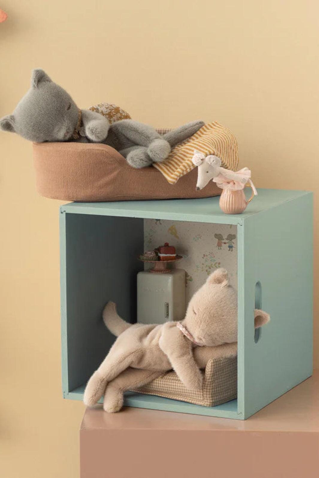 Szary pluszowy kot Maileg w śpiącej pozycji. Kot jest wykonany z poliestru i ma haftowane rysy twarzy z zamkniętymi oczami.