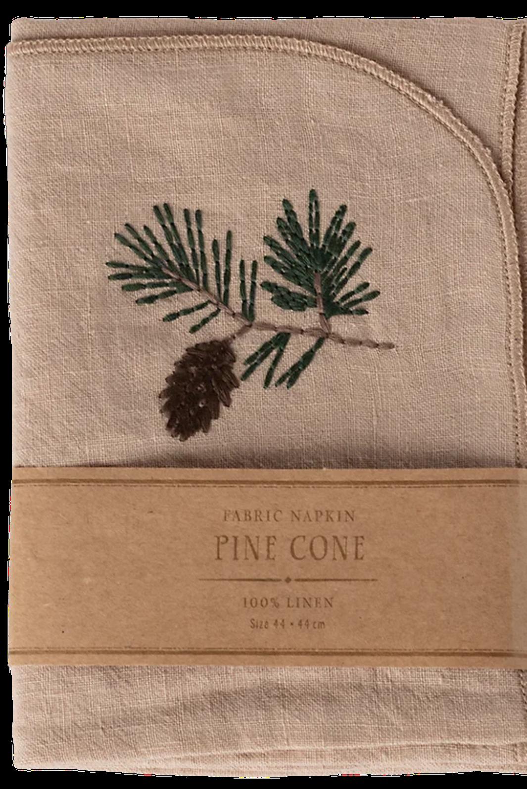 Materiałowa serwetka Maileg z wyhaftowaną szyszką i gałązkami. Wykonana z miękkiego lnu w beżowym odcieniu, a ręcznie rysowany motyw nadaje jej artystyczny charakter.