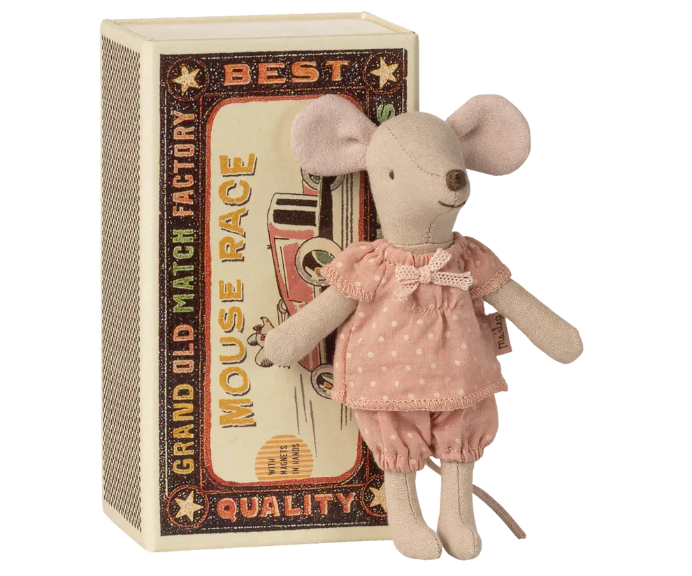 Myszka starsza siostra w pudełku po zapałkach od Maileg. Myszka wykonana jest z bawełny i znajduje się w małym kartonowym pudełku po zapałkach w stylu vintage.