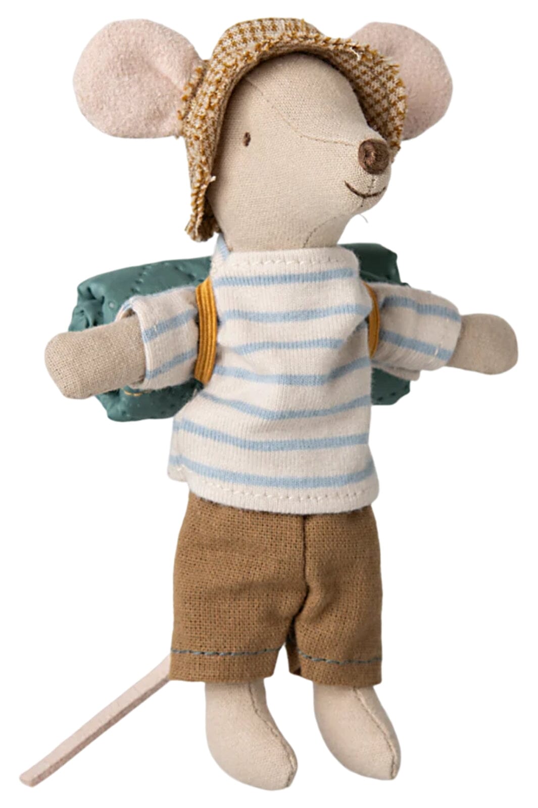 Pluszowa mysz od Maileg w paski i brązowych szortach. Mysz przychodzi z workiem do spania i ma magnesy w rękach do zabawy. Wykonana z bawełny i zatwierdzona dla wszystkich grup wiekowych.