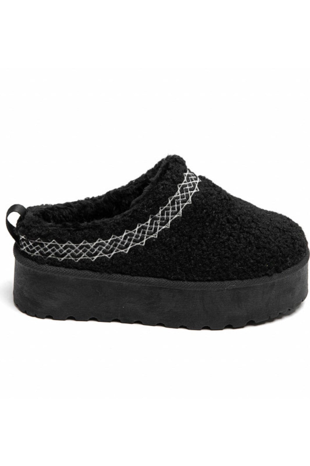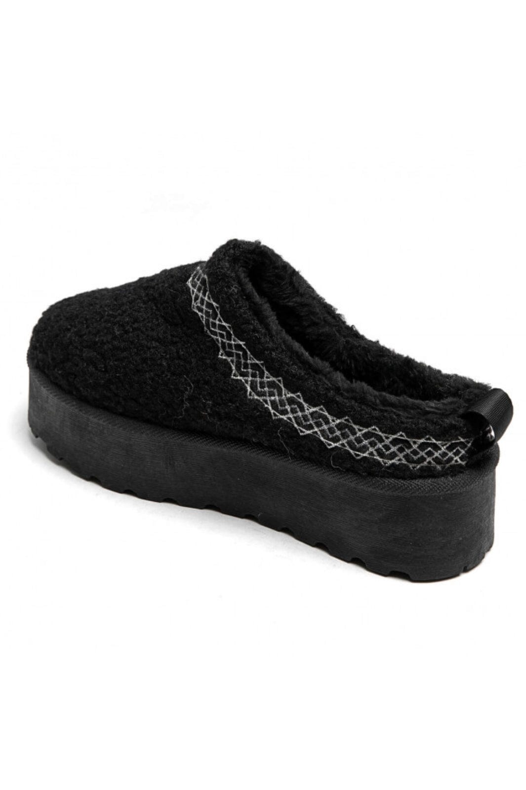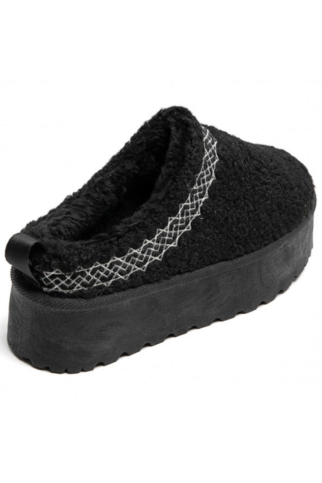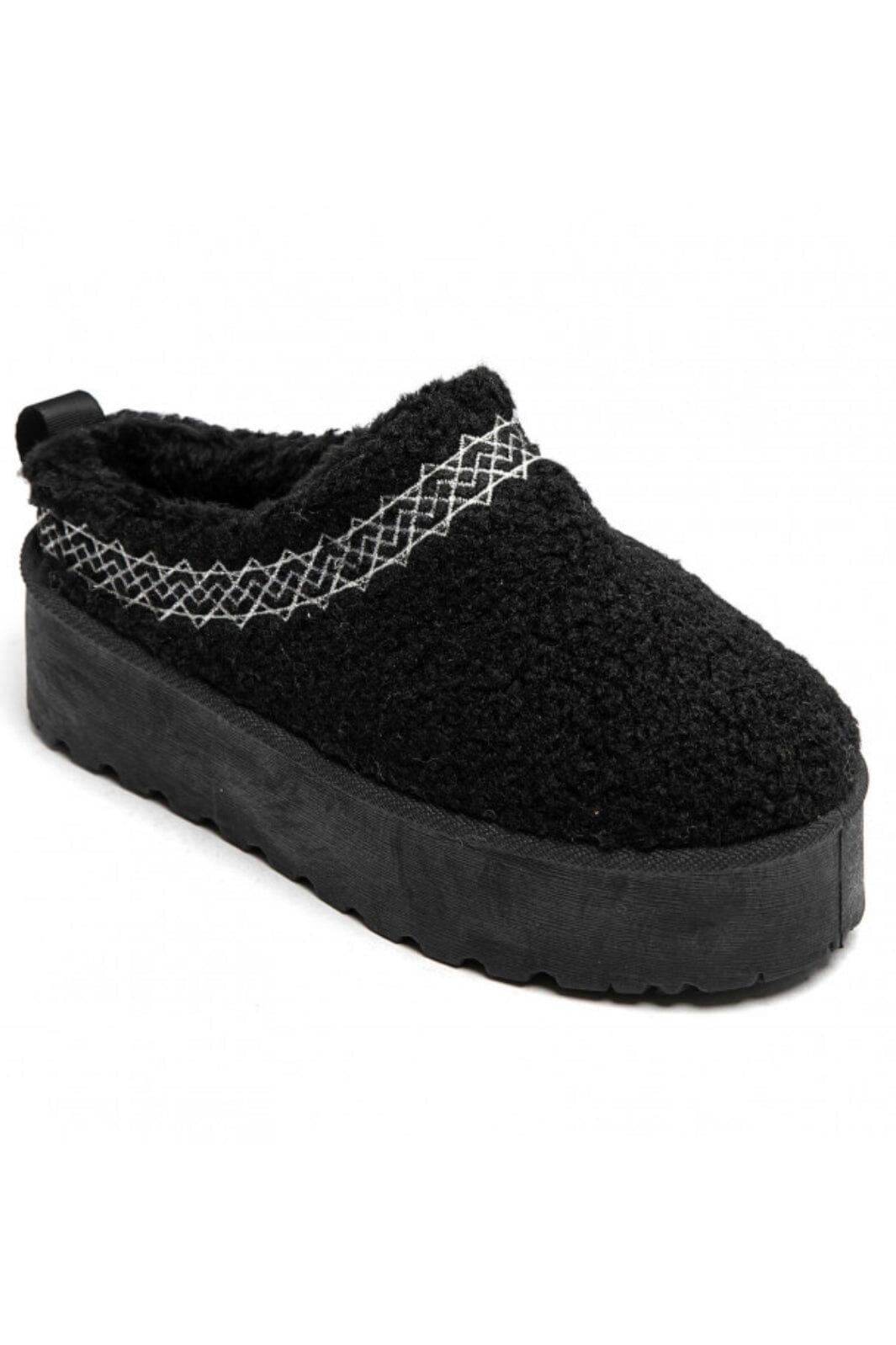 Czarne kapcie od Marta Du Chateau z haftowanym wzorem wzdłuż krawędzi. Buty mają grubą platformę i praktyczny design slip-on, co ułatwia zakładanie i zdejmowanie.