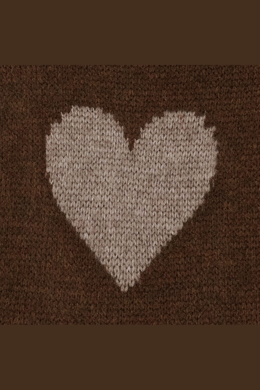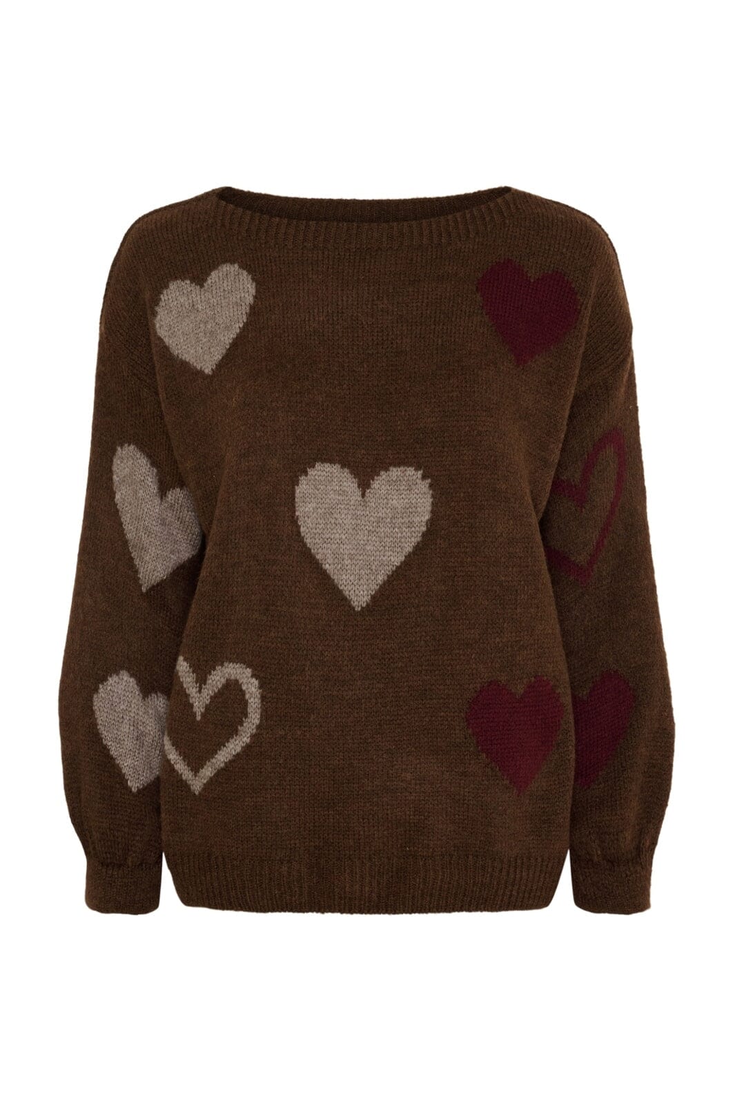 Brązowy sweter od Marta Du Chateau z sercowymi wzorami z przodu w kolorze szarym i bordowym. Tył jest jednolity brązowy bez wzorów.