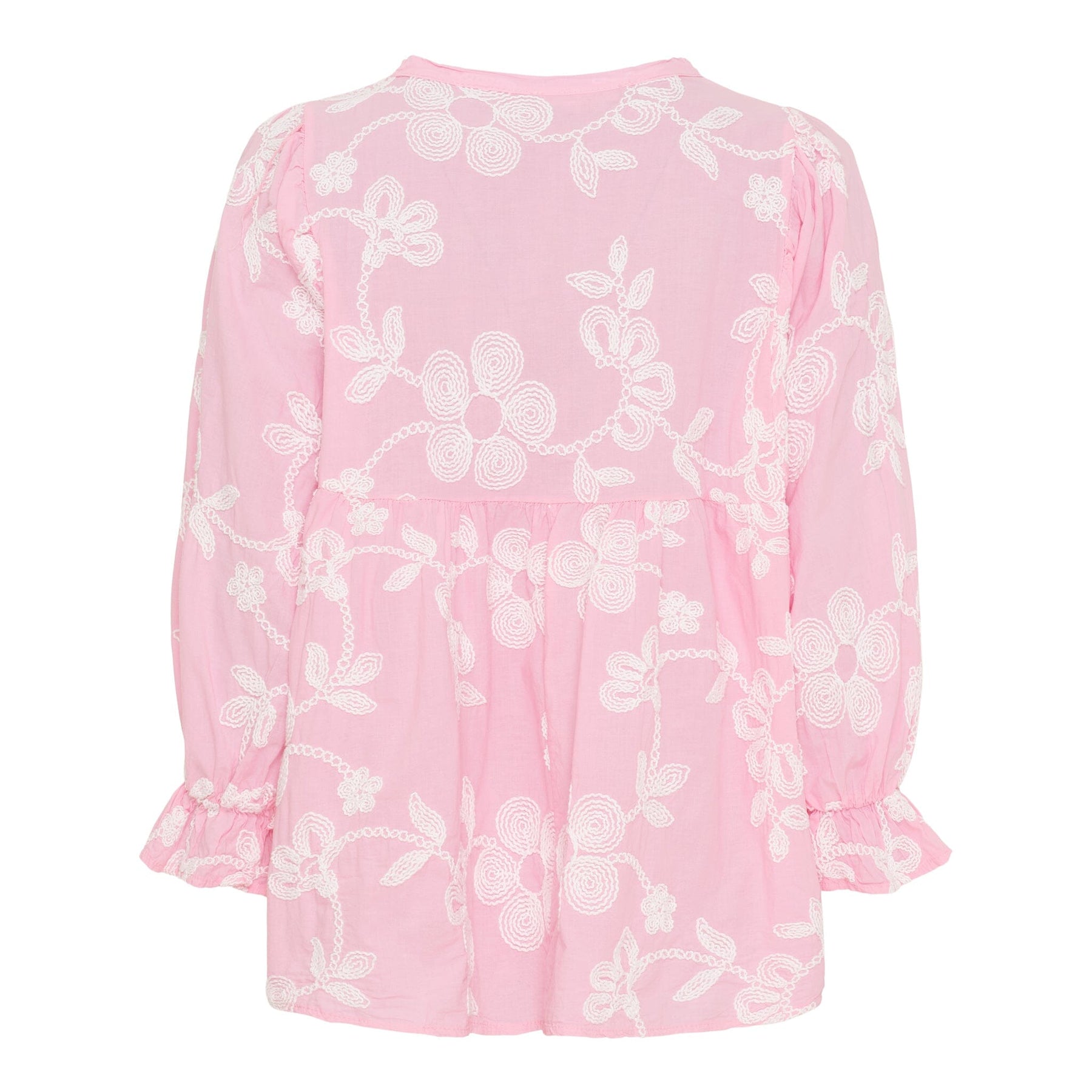 Różowa koszula od Marta Du Chateau z białym haftem kwiatowym. Koszula ma luźny krój z zapięciem na guziki z przodu oraz długimi rękawami z marszczonymi mankietami.