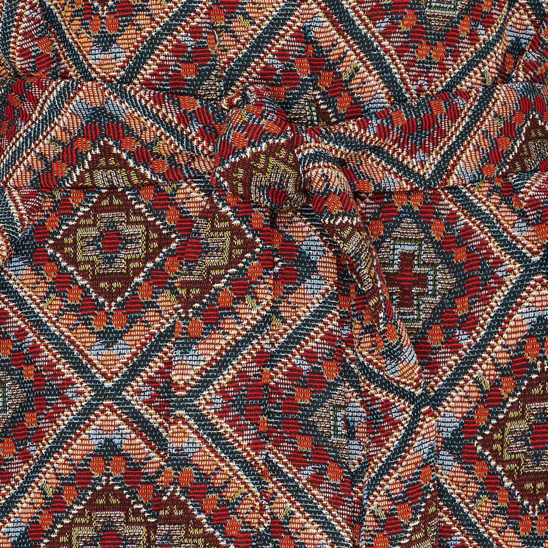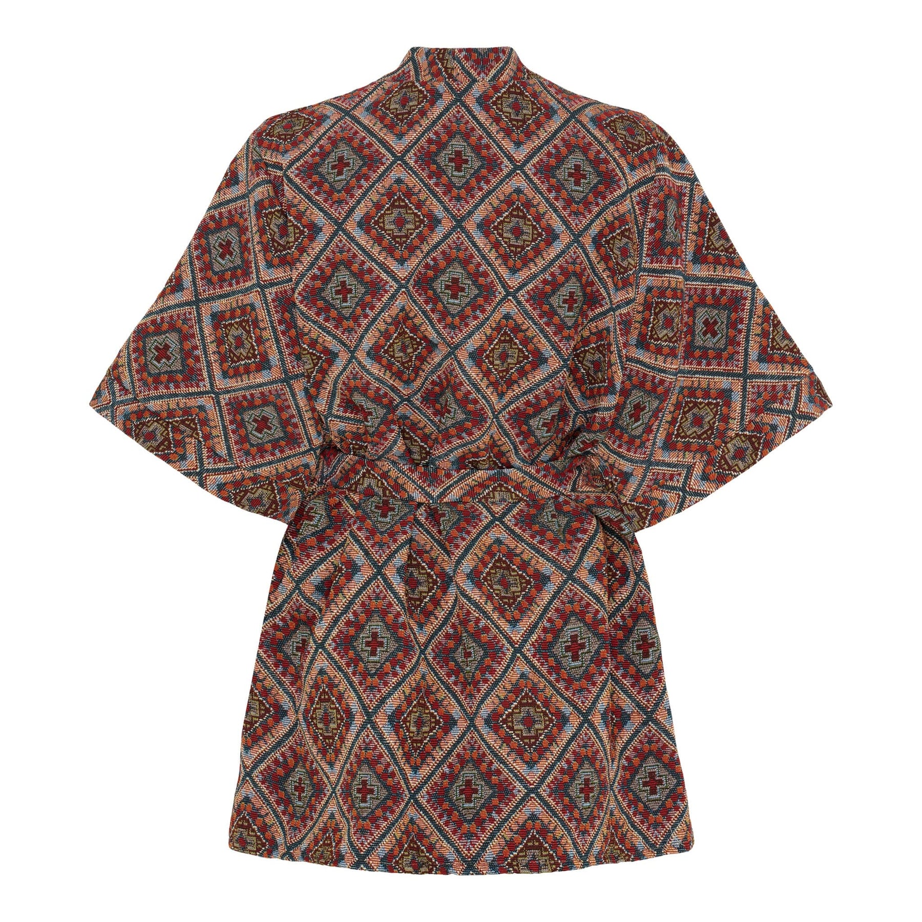 Kimono od Marta Du Chateau z geometrycznym wzorem w odcieniach burgunda, granatu i pomarańczy. Szerokie rękawy i luźny krój zapewniają swobodny fason z dużą swobodą ruchów.