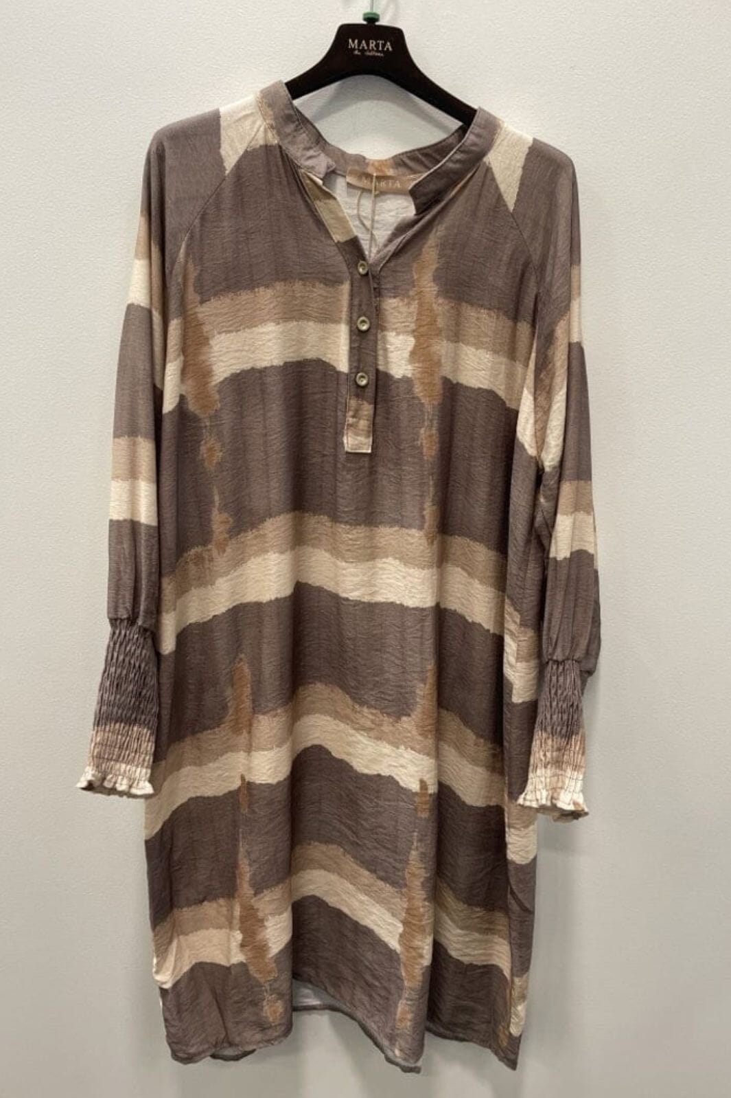 Midi sukienka od Marta Du Chateau z szerokimi poziomymi paskami w brązowych i beżowych odcieniach. Sukienka ma luźny krój i długie rękawy.