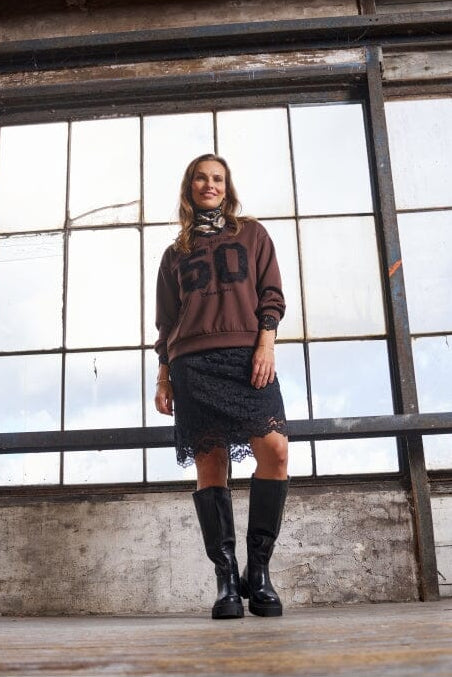 Czarna spódnica od Marta du Château z koronkowym wzorem w kwiatowy deseń. Spódnica ma muszelkowe wykończenie dołu i sięga do kolan.