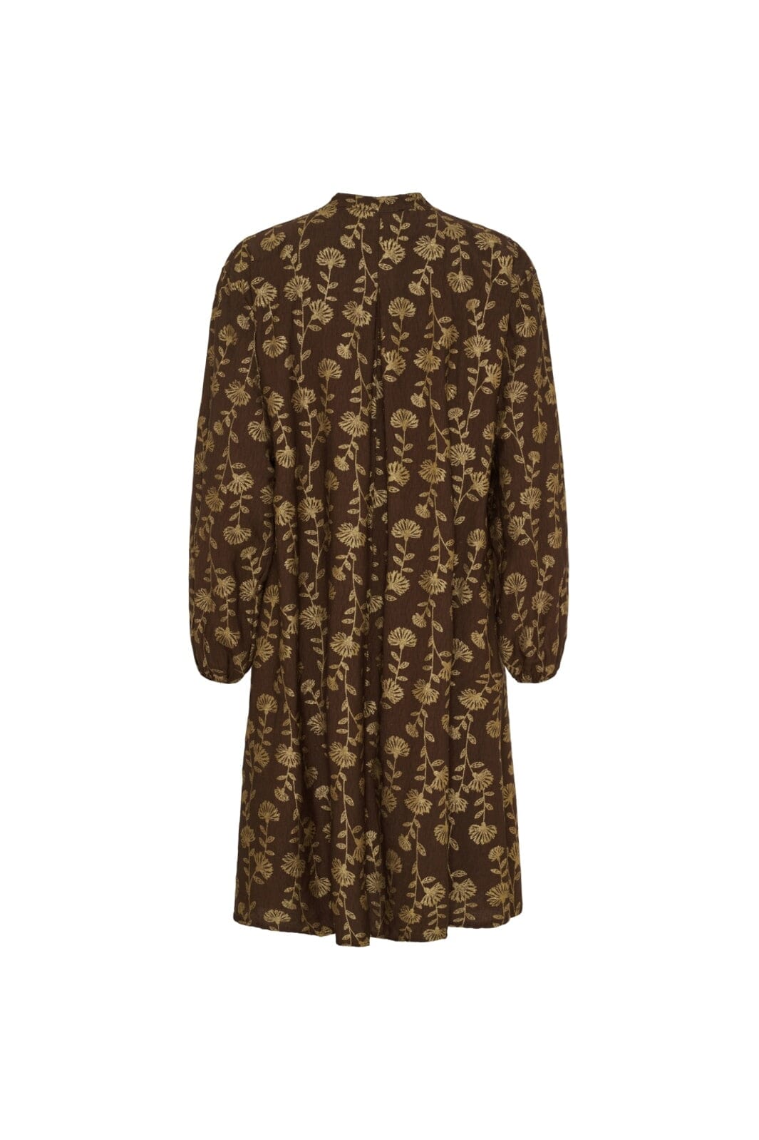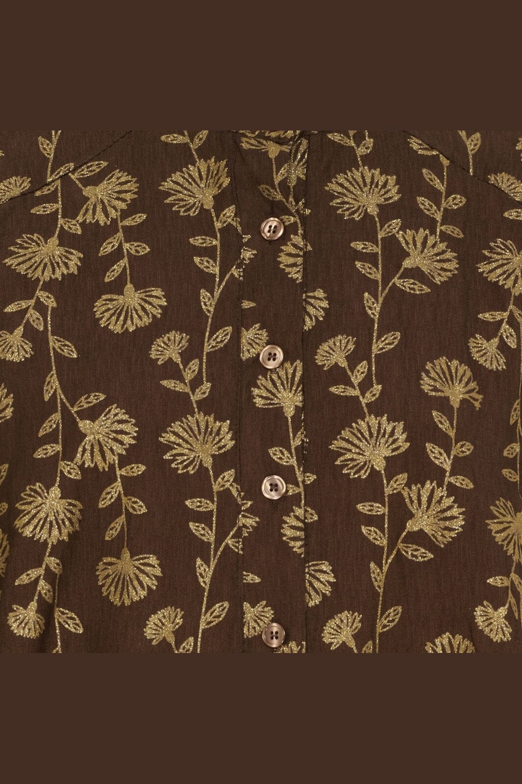 Brązowa sukienka od Marta Du Chateau z złotym nadrukiem kwiatowym. Sukienka ma guziki na całej długości, kołnierzyk i długie rękawy z gumką przy nadgarstkach.