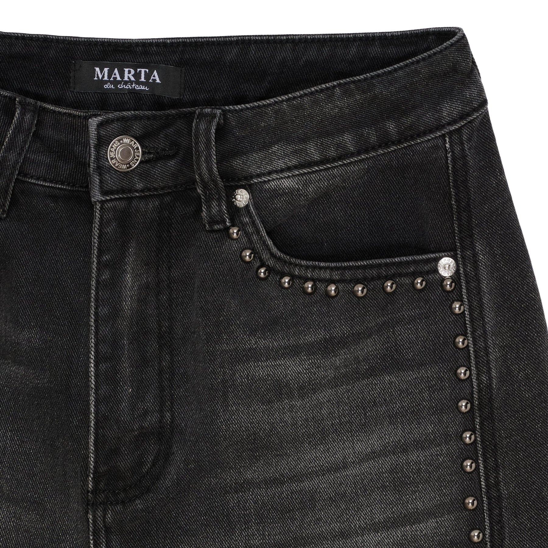 Szare dżinsy od Marta Du Chateau z efektem acid wash i dekoracyjnymi ćwiekami wzdłuż boków. Spodnie mają wysoki stan i luźny krój o długości do kostek.