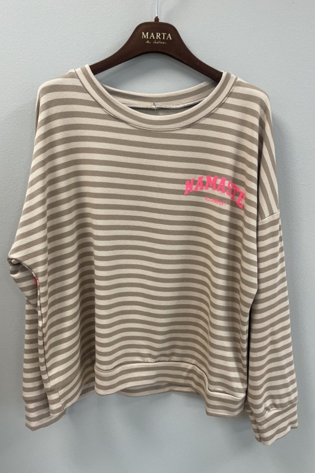 Beżowa bluzka w paski od Marta Du Chateau, wykonana z bawełny i elastanu. Bluzka ma poziome paski w kolorze beżowym i białym oraz różowy napis NAMASTE z przodu.
