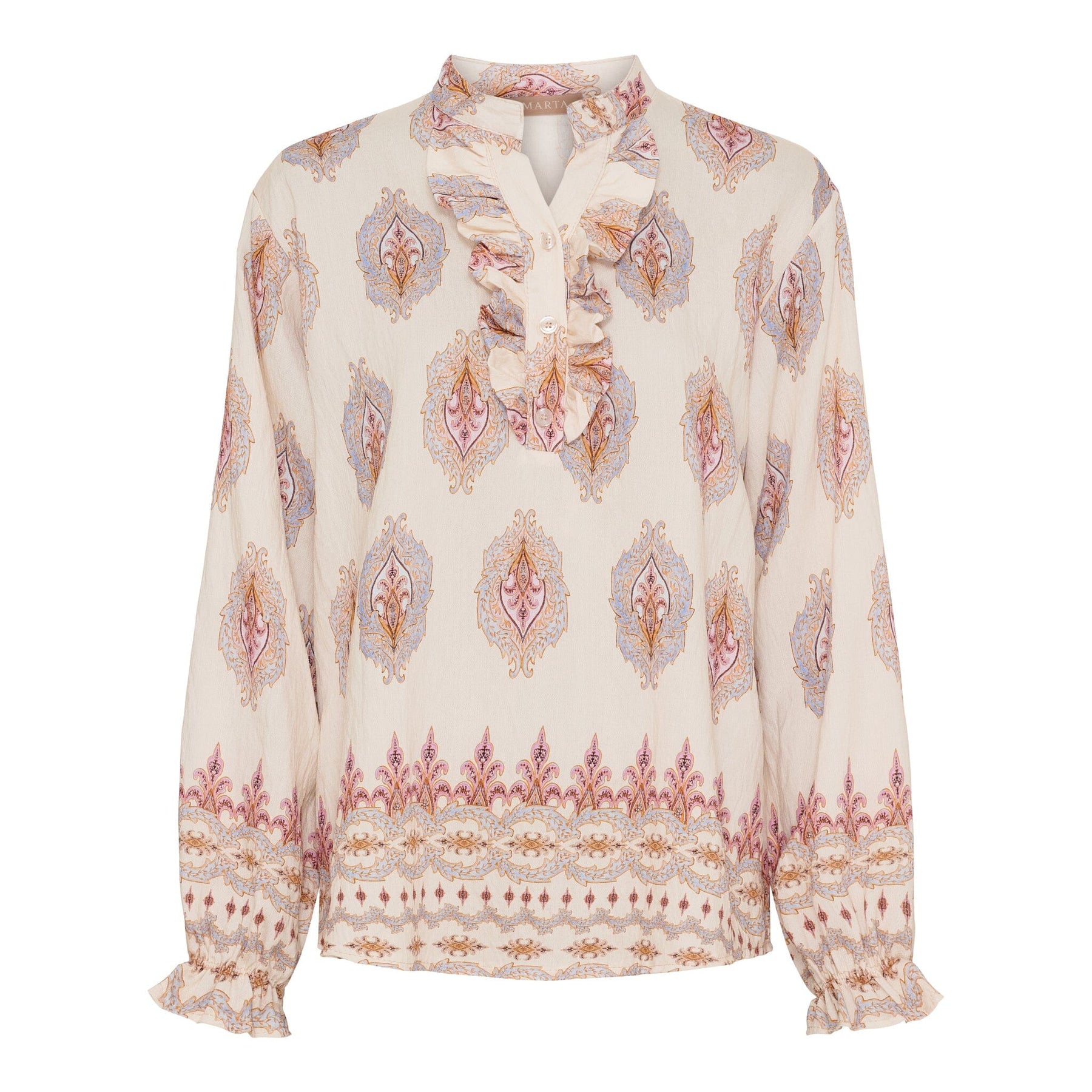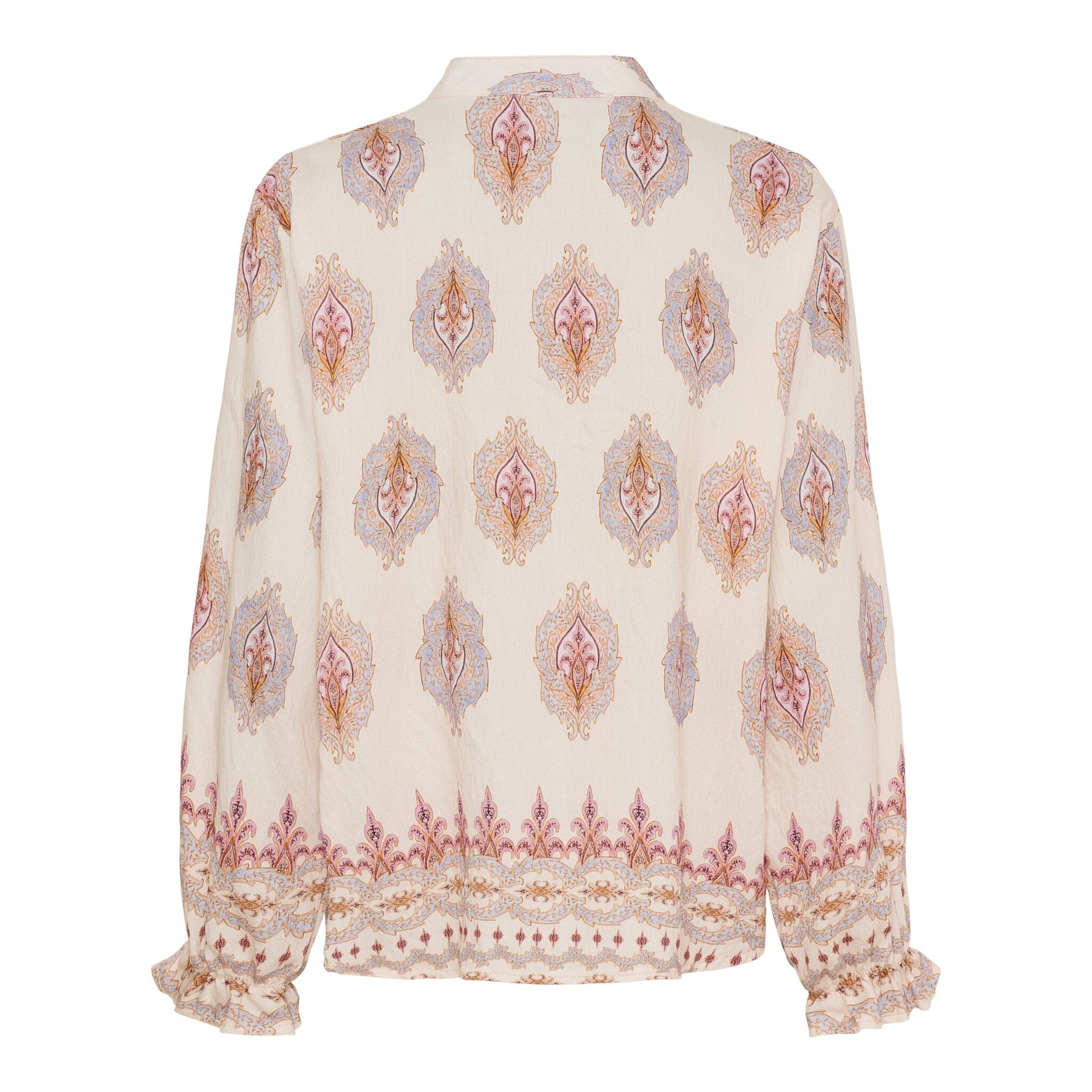 Koszula od Marta Du Chateau z wzorem paisley w różowym, niebieskim i złotym na jasnym tle. Koszula ma detale w falbanki przy kołnierzyku oraz marszczone rękawy przy nadgarstkach.