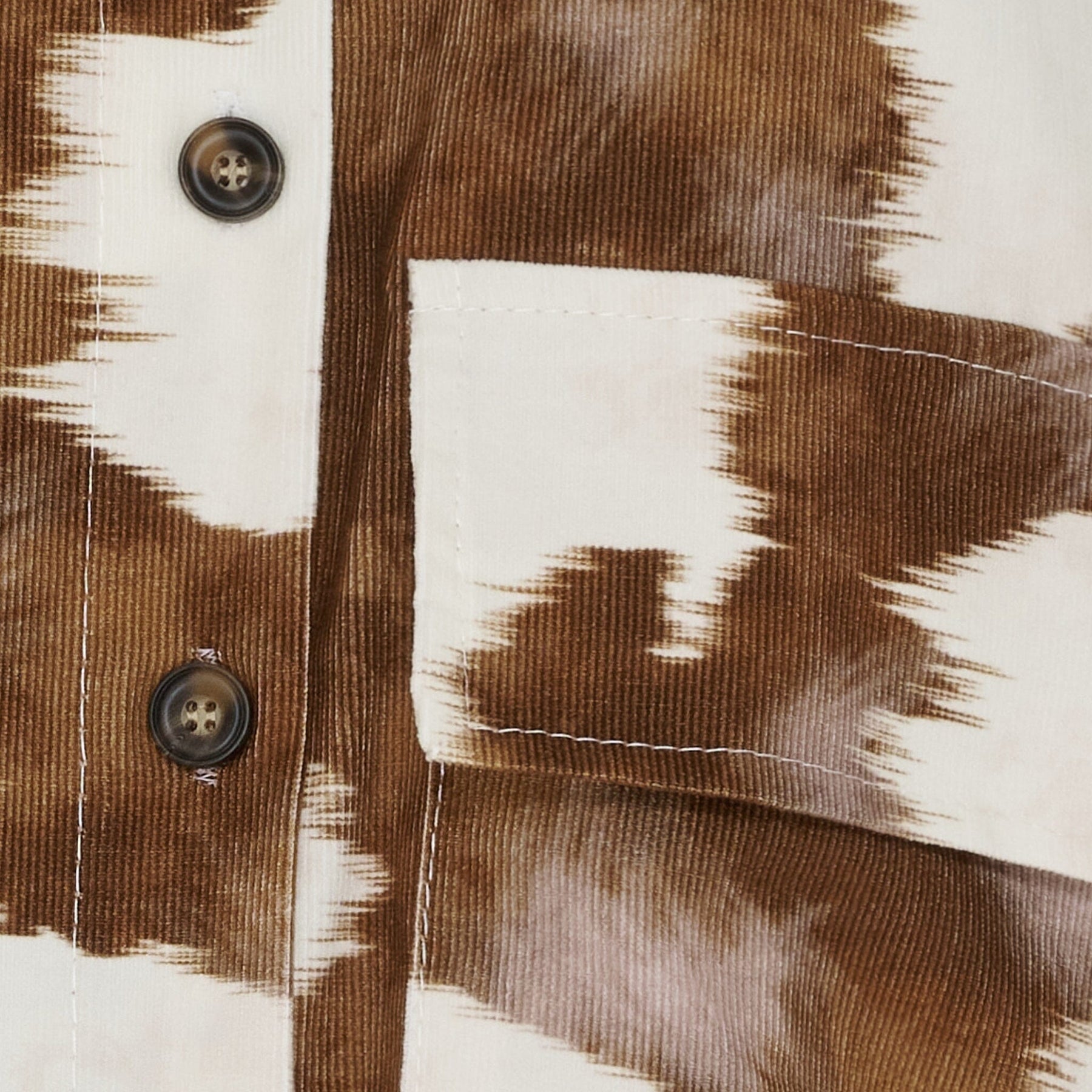 Koszula od Marta Du Chateau z brązowym i białym wzorem inspirowanym krowami. Ma kołnierzyk, długie rękawy i kieszeń na piersi po lewej stronie.