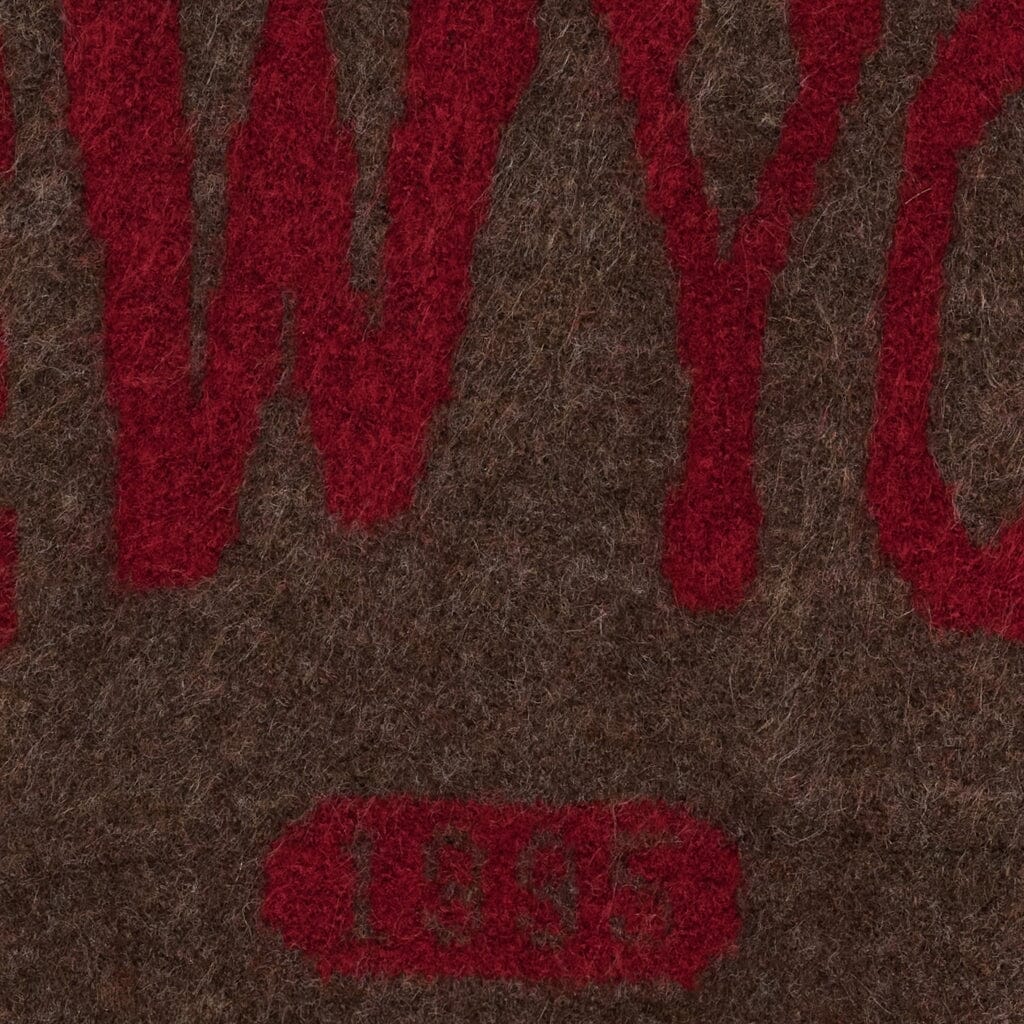 Sweter od Marta Du Chateau w połączeniu brązu i bordowego. Sweter ma marmurkowy wzór z czerwoną grafiką.