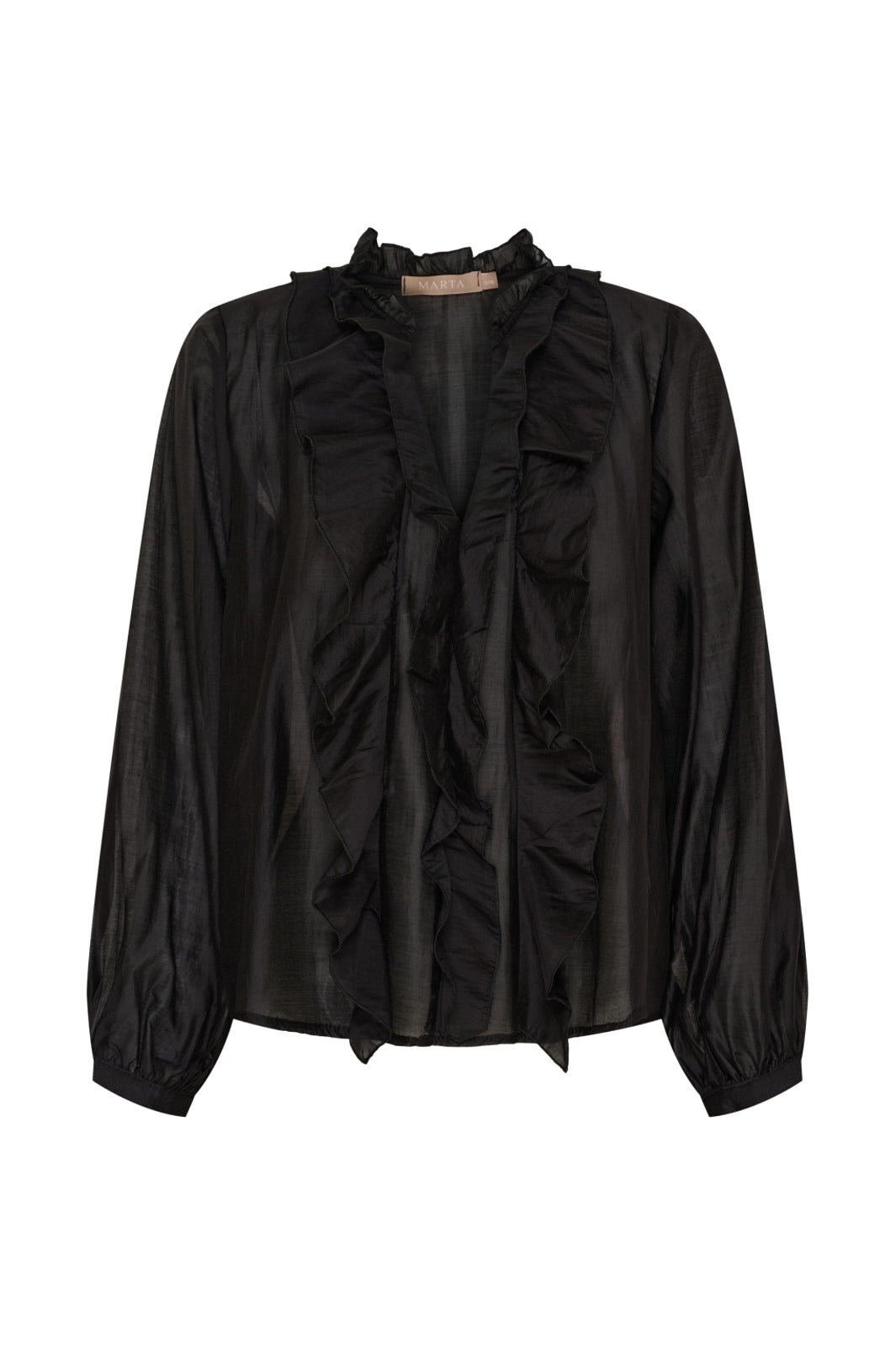 Czarna koszula od Marta Du Chateau z dekoltem w kształcie V i detalami z falbanek. Koszula ma długie rękawy i jest wykonana z lekkiego, przezroczystego materiału z falbanami wzdłuż dekoltu.