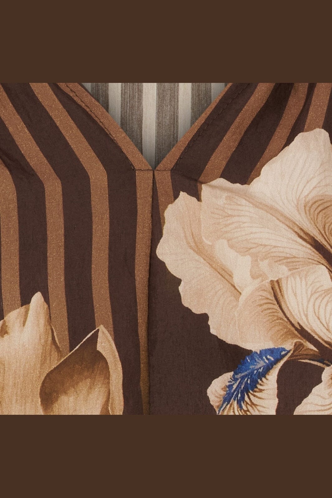 Koszula marki Marta Du Chateau, wykonana w 100% z wiskozy, z kwiatowym nadrukiem w beżowych i niebieskich odcieniach na brązowym tle. Pionowe paski dodają wizualnej struktury.