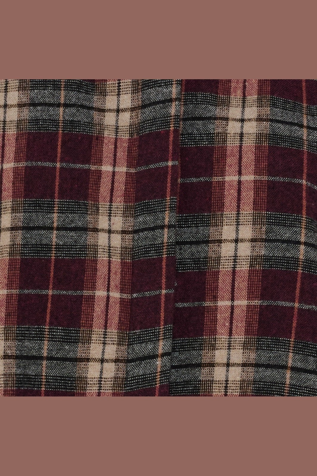Koszulka w kratę od Marta Du Chateau w kolorach bordowym, beżowym i czarnym. Koszulka ma klasyczny kołnierzyk i oversize'owy krój z długimi rękawami i guzikami.