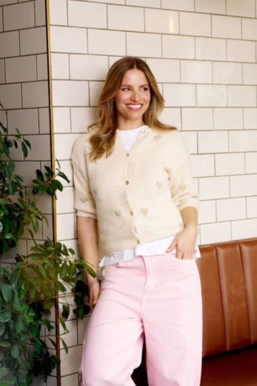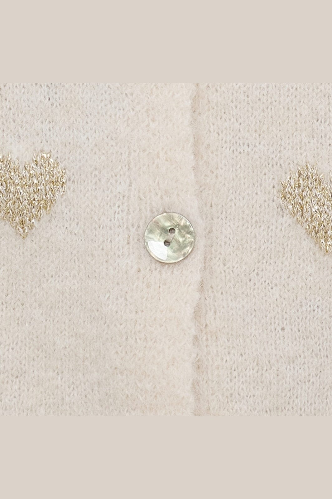 Beżowy kardigan od Marta Du Chateau, wykonany z dzianiny. Kardigan ma małe, haftowane na powierzchni wzory w kształcie serc oraz okrągły dekolt.