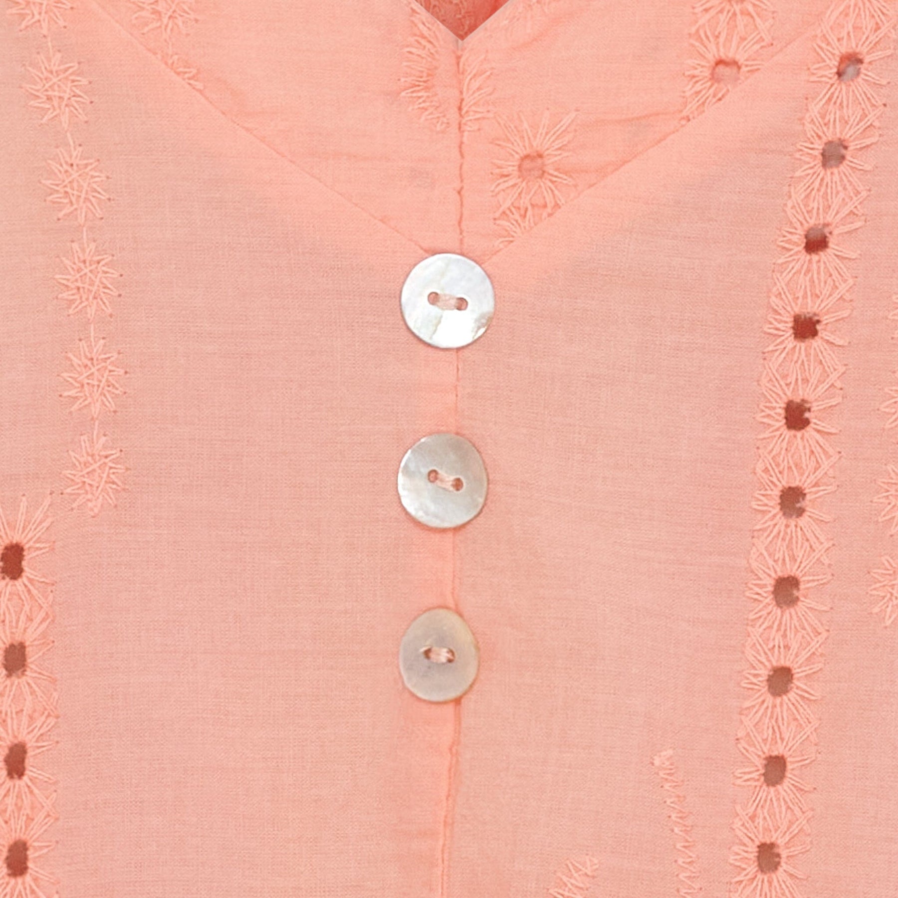 Pomarańczowy top od Marta Du Chateau z haftowanym wzorem i dekoltem w kształcie V. Top ma trzy guziki z przodu i luźny krój, który zapewnia dobrą swobodę ruchów.