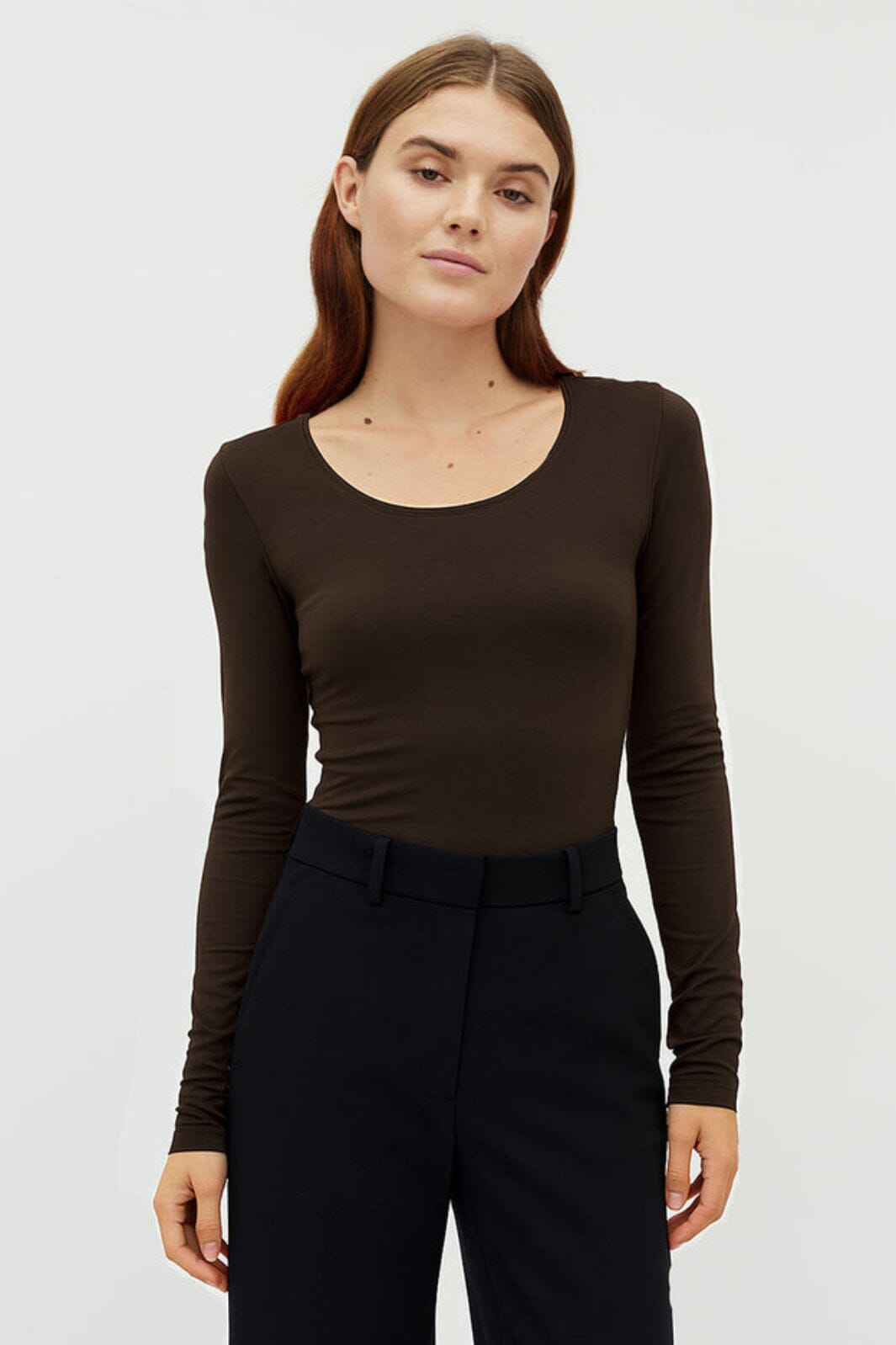 Bluzka z długim rękawem marki MbyM w ciemnobrązowym kolorze. Bluzka ma dopasowany krój i jest wykonana z modalu z dodatkiem elastanu.