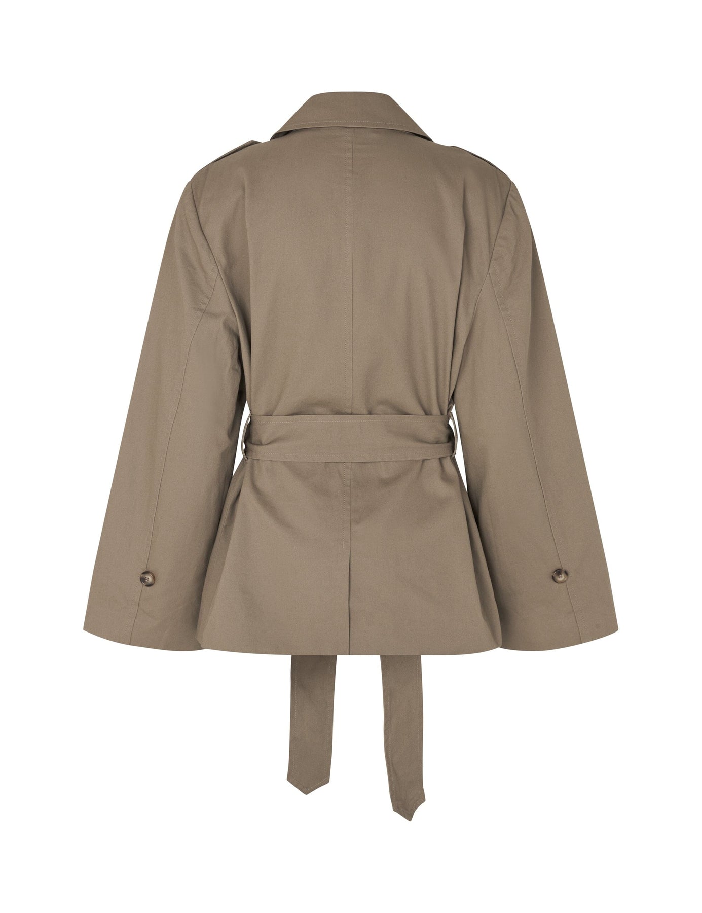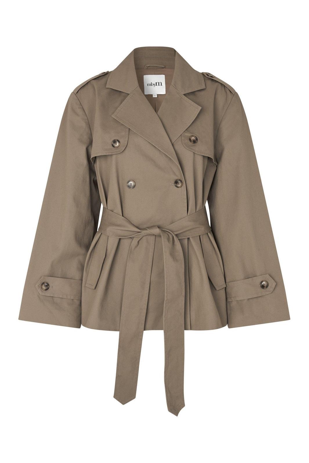 Kurtka marki MbyM w piaskowym odcieniu. Kurtka wykonana jest w 100% z bawełny i ma dwurzędowy przód z wiązanym paskiem w talii.