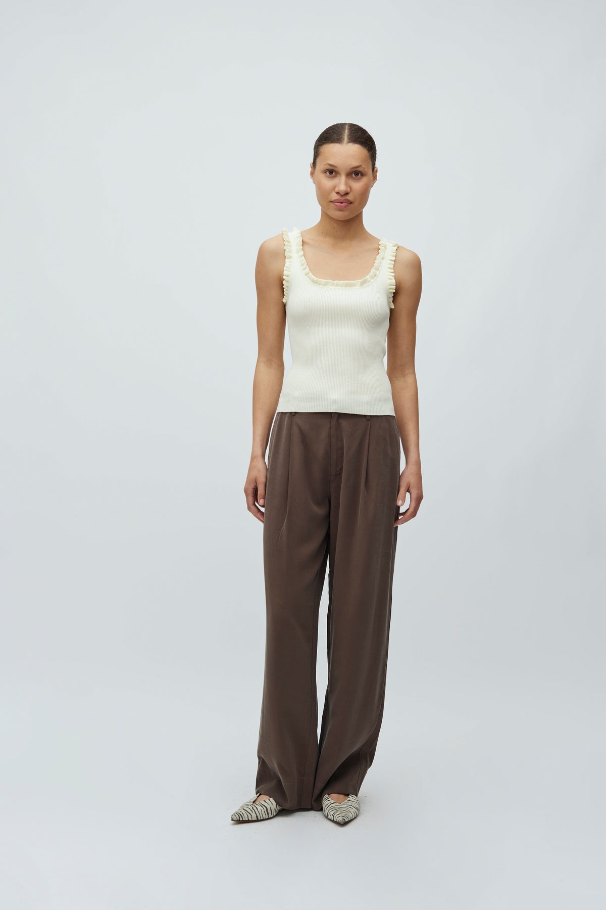 Bluzka bez rękawów marki MbyM w jasnym, kremowożółtym kolorze. Model ma dopasowany krój z falbankami wzdłuż kwadratowego dekoltu i ramiączek.