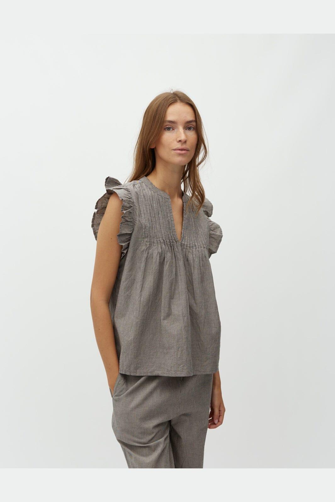 Bluzka w paski od MbyM w brązowych i szarych odcieniach. Bluzka ma falbany przy rękawach oraz dekoracyjne przeszycia na tkaninie.
