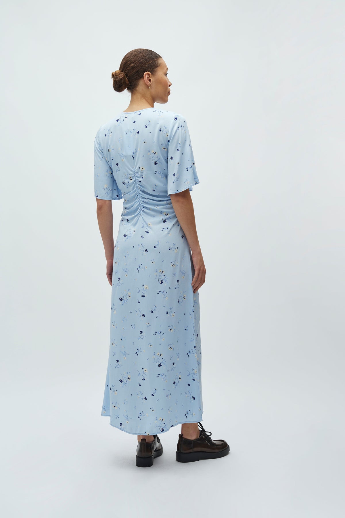 Sukienka marki MbyM w jasnoniebieskim odcieniu z kwiatowym nadrukiem. Sukienka ma krótkie rękawy i dekolt w kształcie litery V.