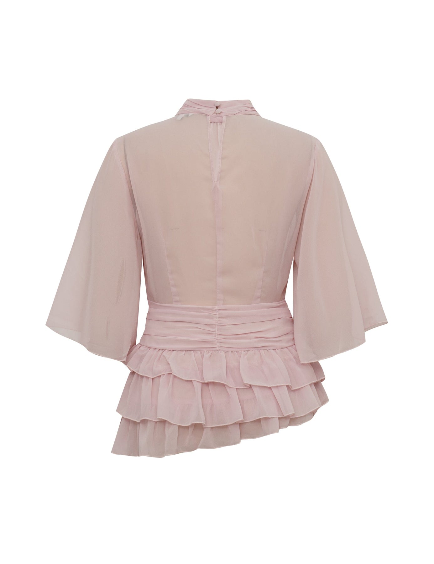Różowa bluzka marki MbyM w bardzo jasnym odcieniu różu. Bluzka ma wysoki kołnierz, rękawy 3/4 oraz falbanki w talii.
