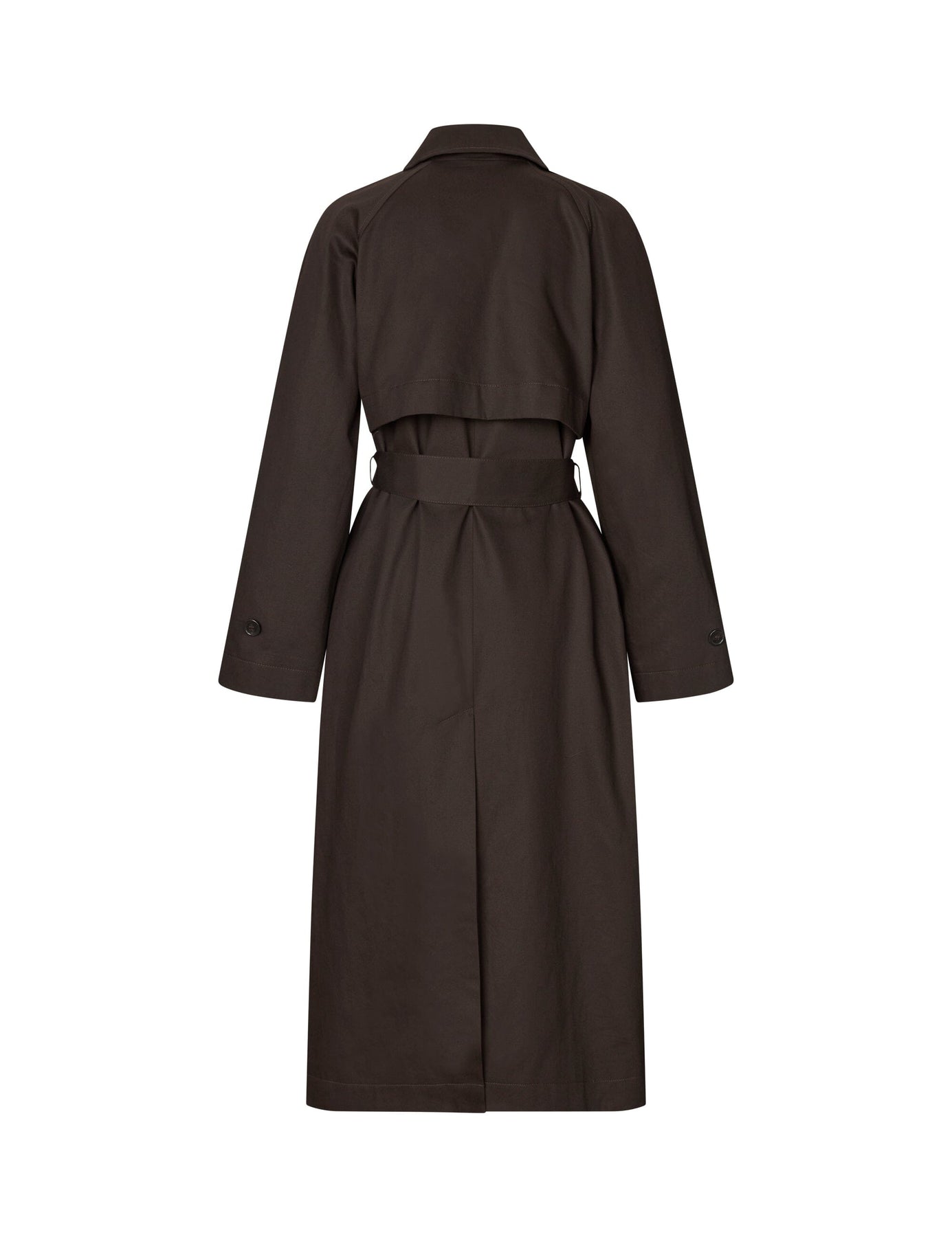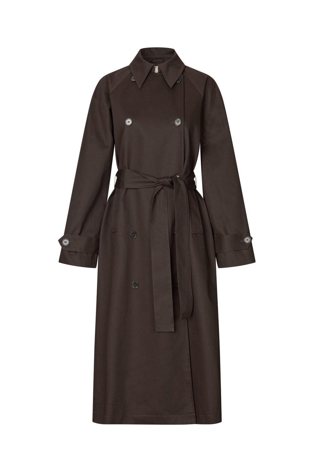 Trencz od MbyM, wykonany w 100% z bawełny w ciemnobrązowym odcieniu. Płaszcz ma dwurzędowy krój z wiązanym paskiem w talii.