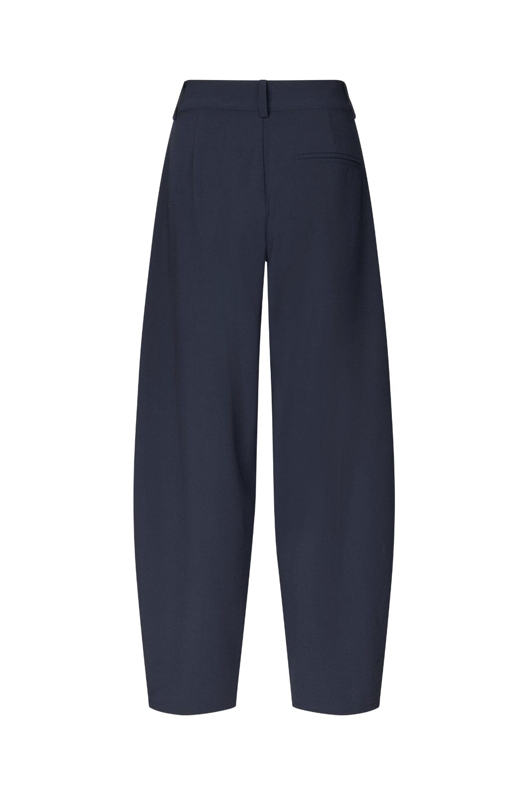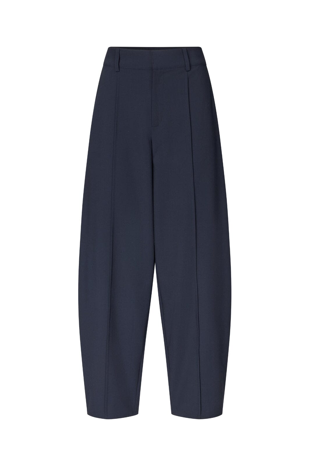 Ciemnoniebieskie spodnie od MbyM z wysokim stanem i szerokimi nogawkami. Spodnie mają luźny krój i sięgają do połowy łydki.