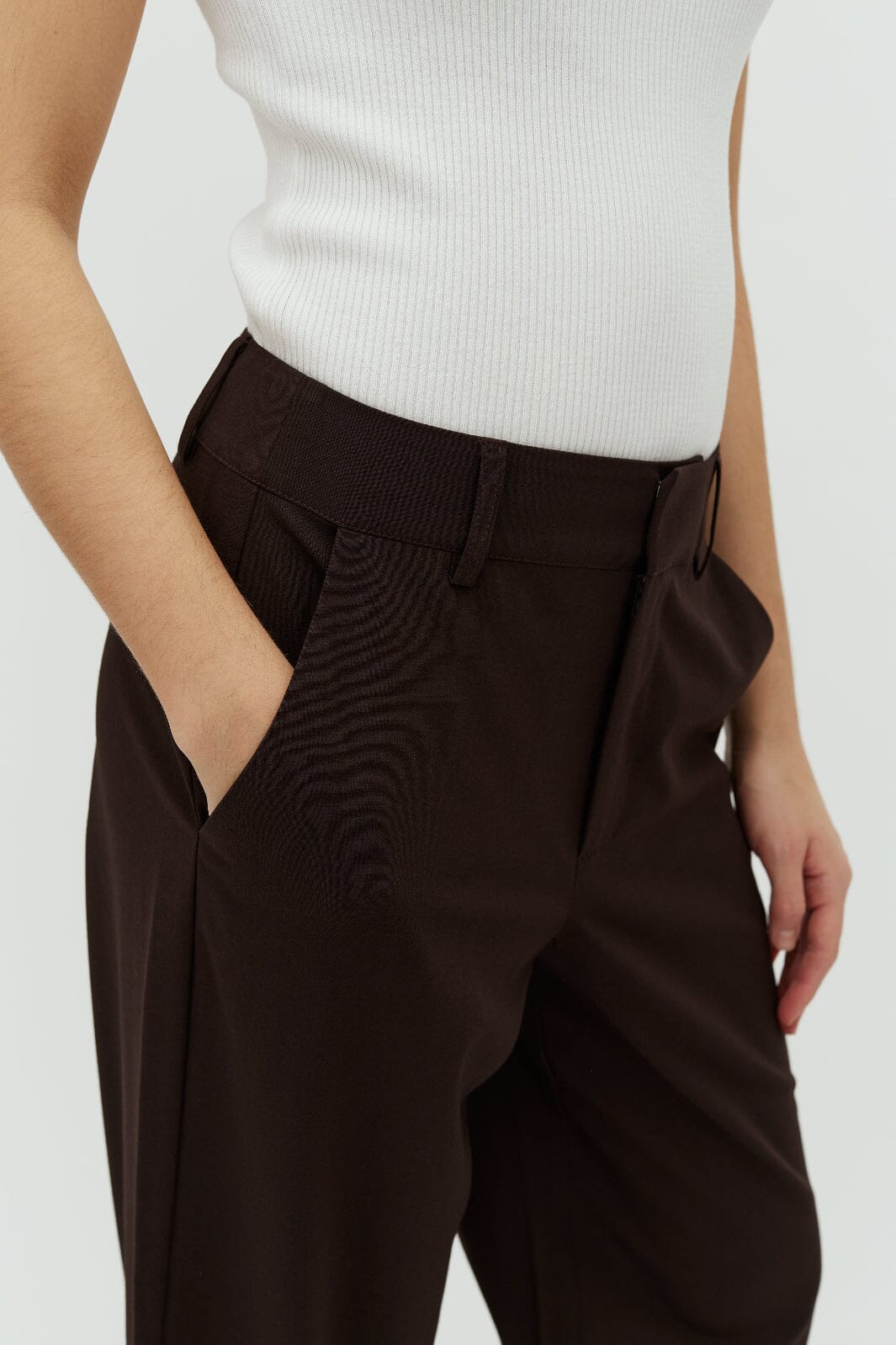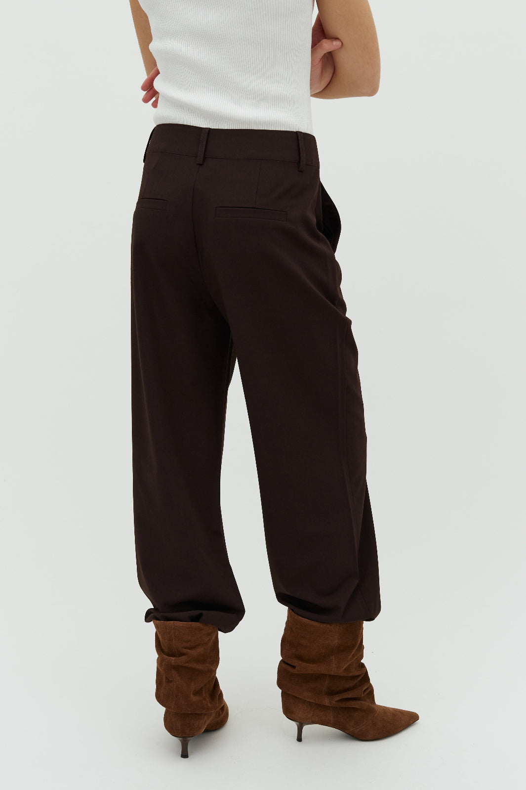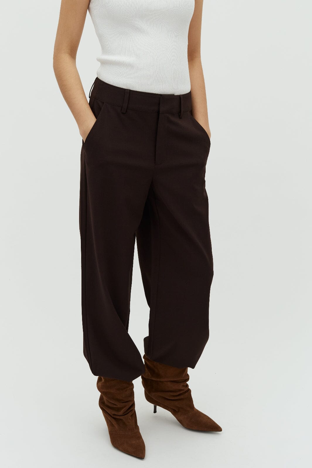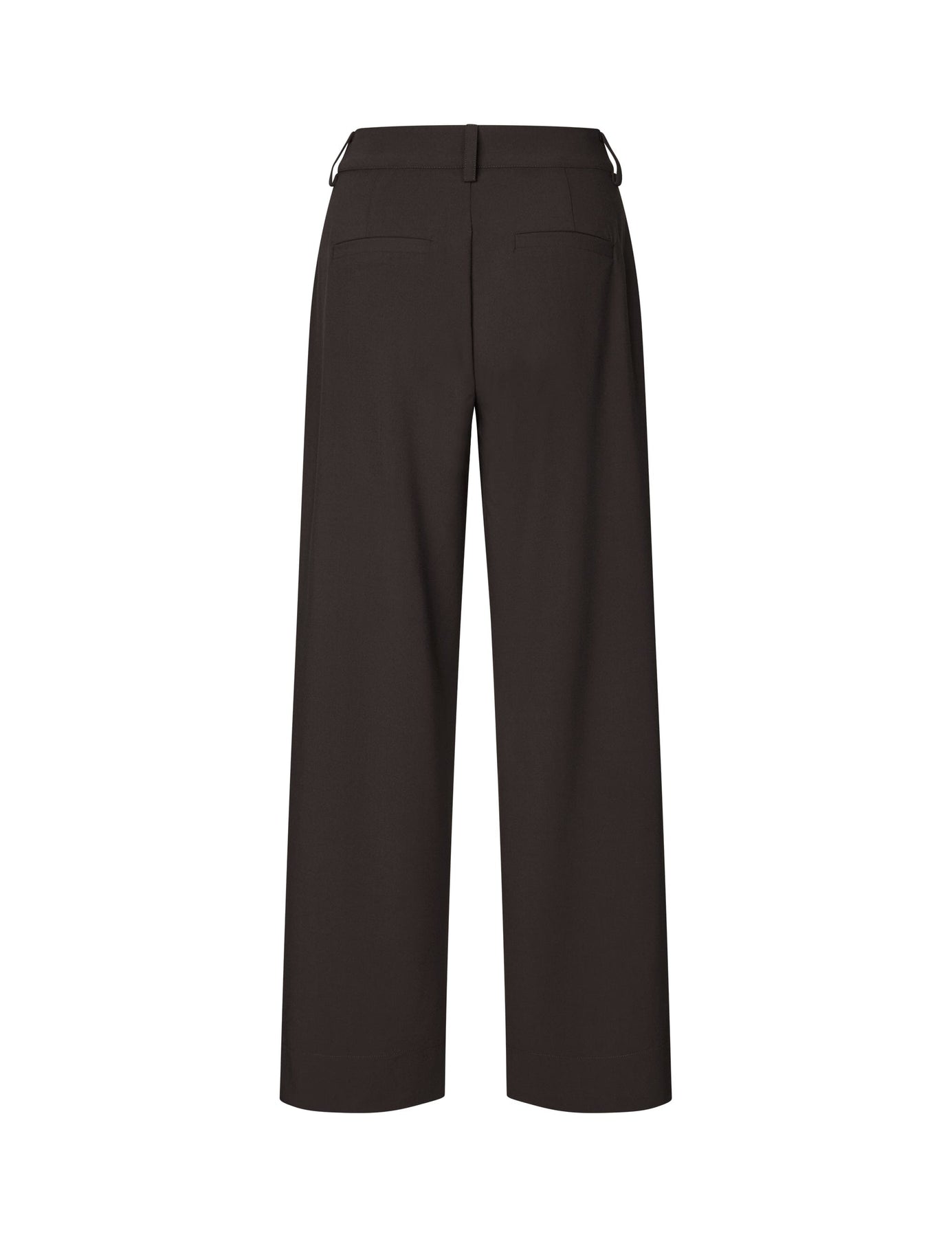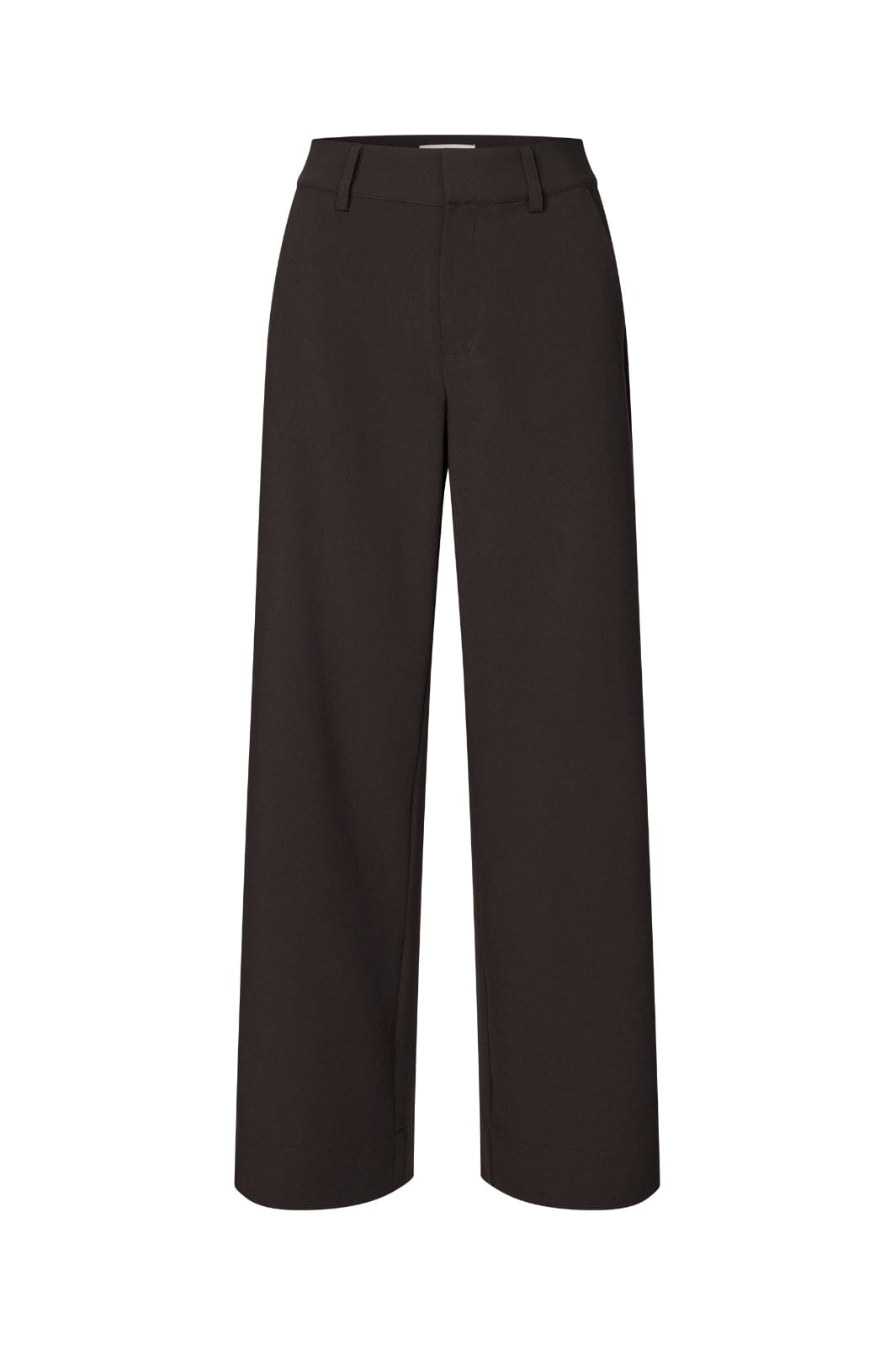 Ciemnobrązowe spodnie marki MbyM z prostymi nogawkami, szlufkami na pasek i kieszeniami po bokach. Spodnie mają luźny krój i sięgają do podłogi.