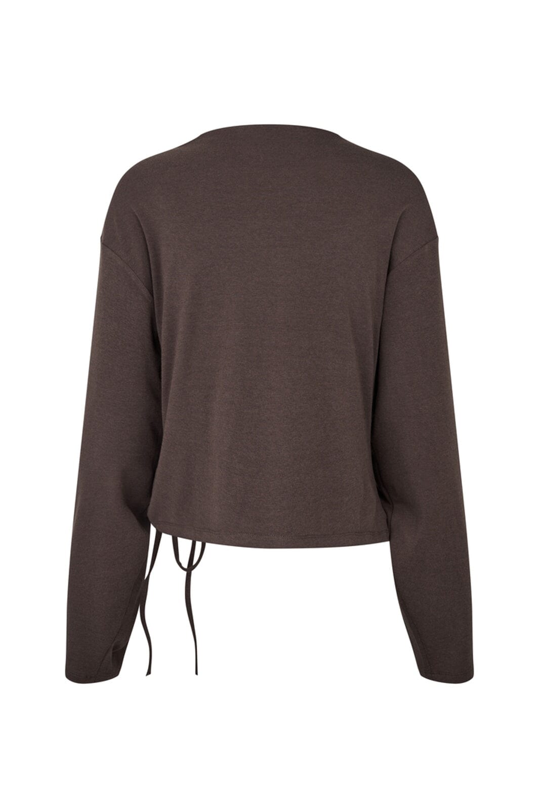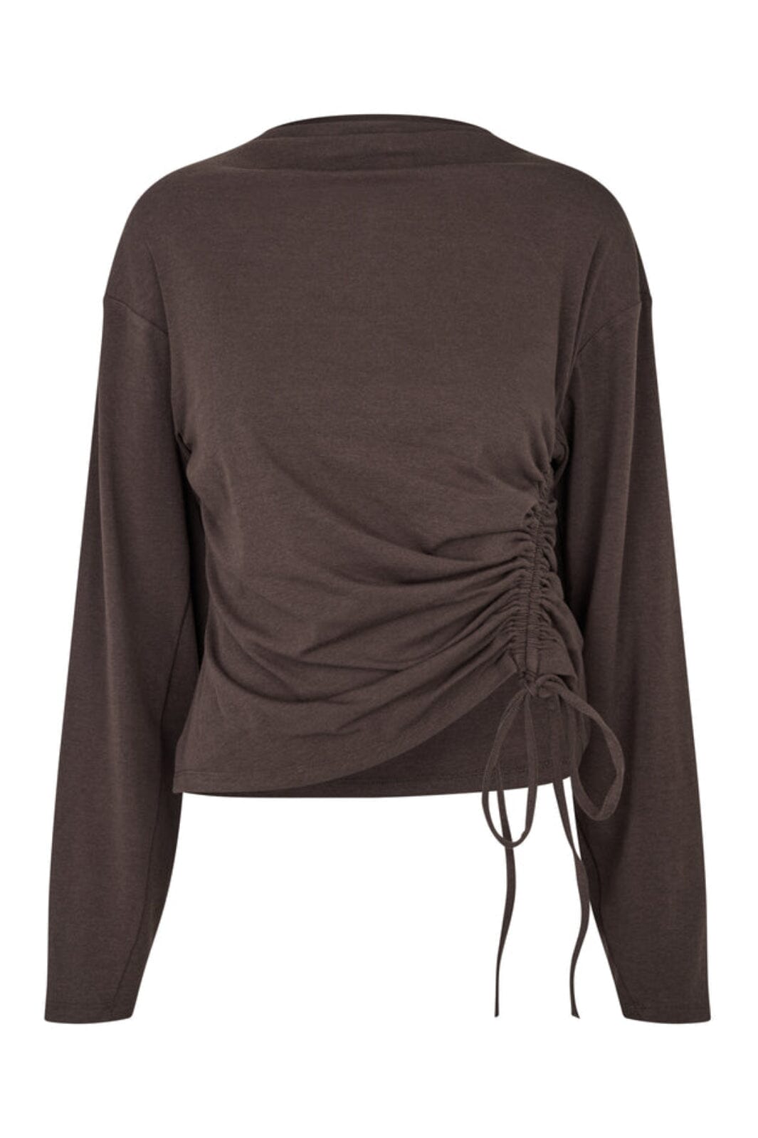 Ciemnobrązowa bluzka z długim rękawem od MbyM z asymetrycznym, marszczonym detalem z boku. Bluzka ma regulowane troczki i okrągły dekolt.