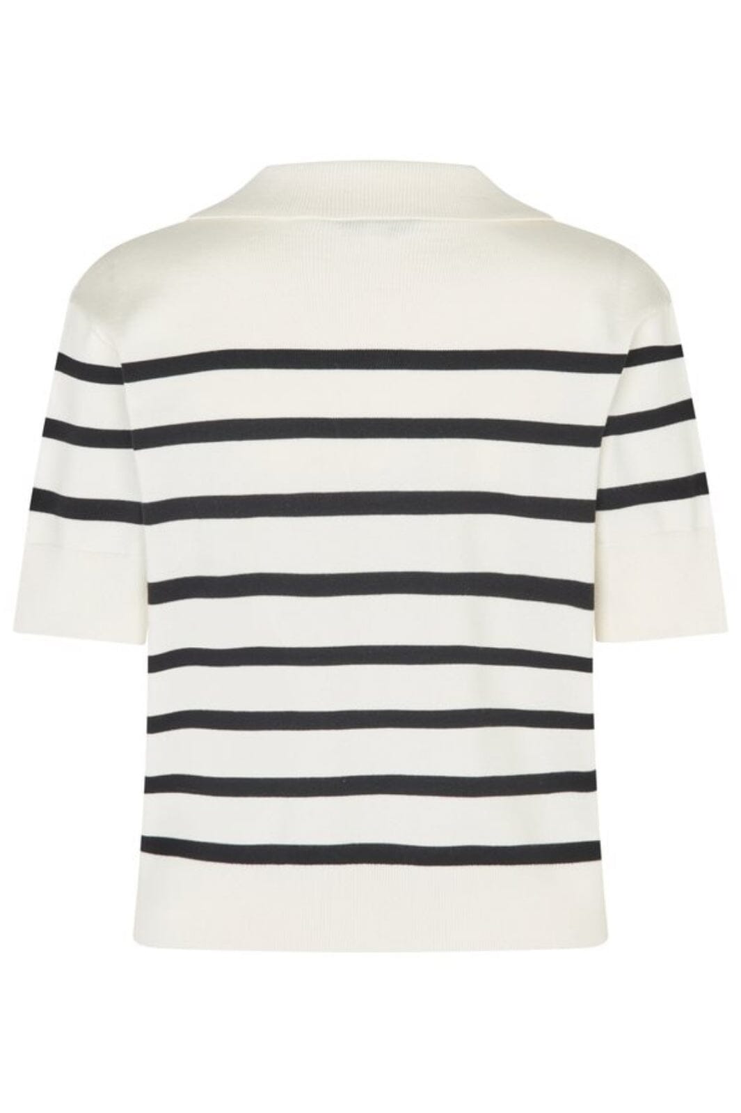 Krótkie rękawy bluzka od MbyM w czarno-białe paski. Ma kołnierzyk polo i dekolt w kształcie litery V. Bluzka uszyta jest z miękkiej jakości z klasycznym wzorem w paski.