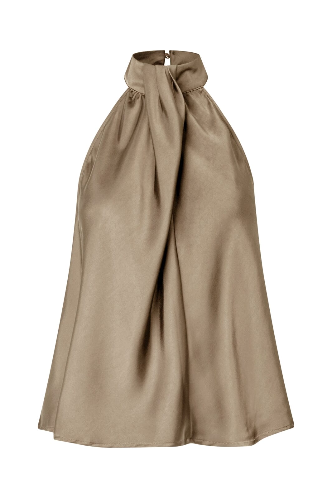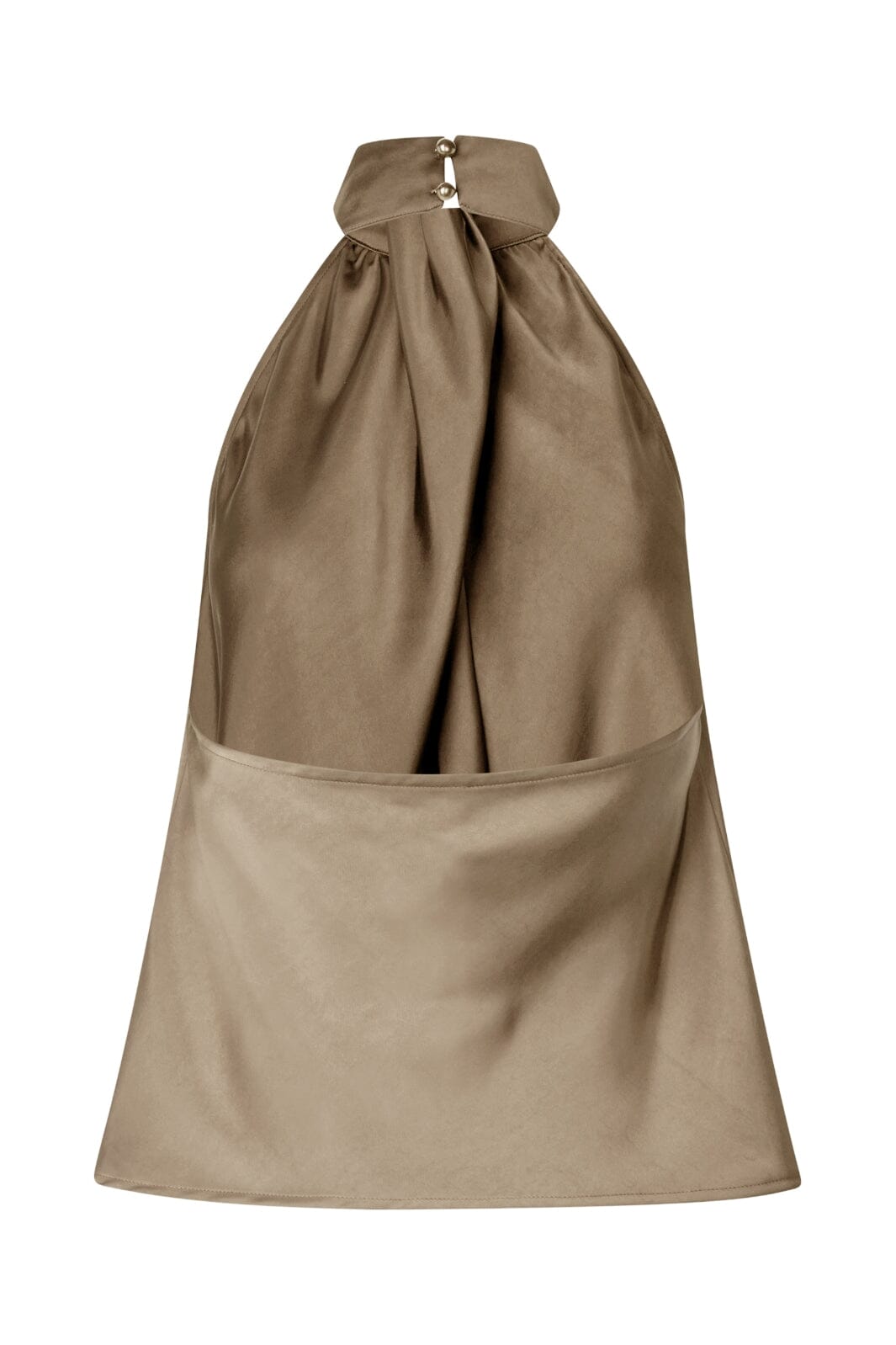 Top bez rękawów od MbyM w kolorze Fallen Rock. Ma wysoki kołnierz z drapowanym detalem i ramiączkami. Top ma normalny krój i zapięcie na guziki z tyłu szyi.
